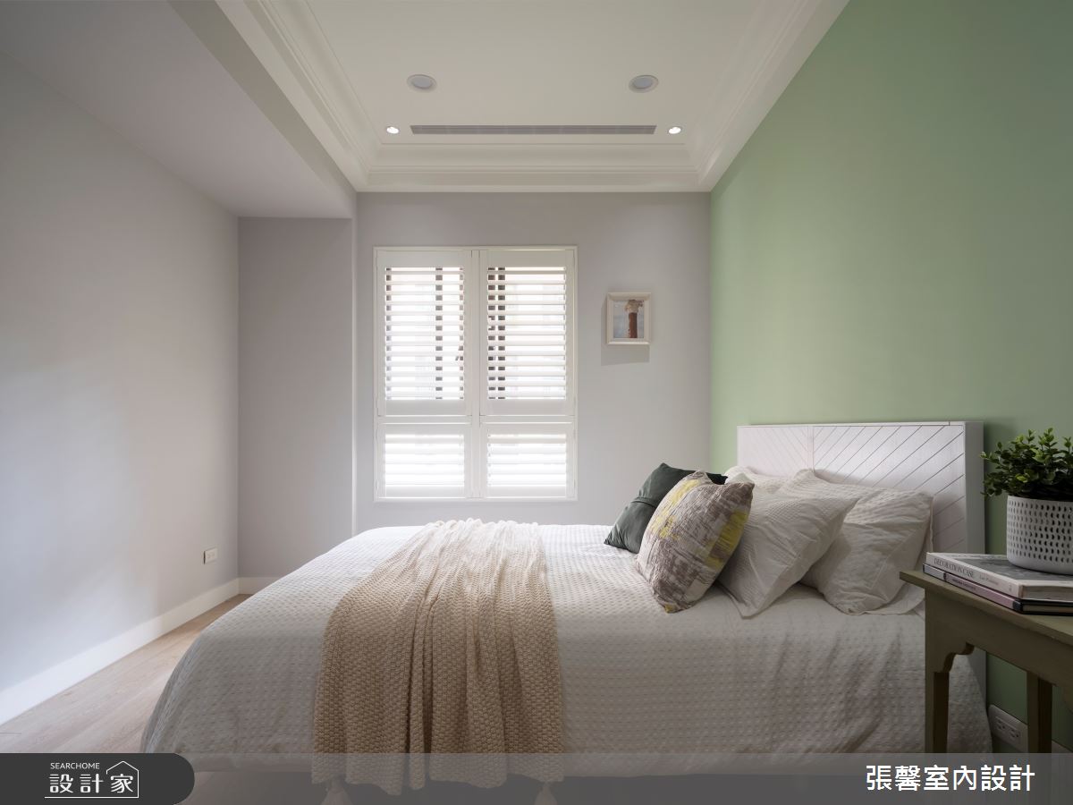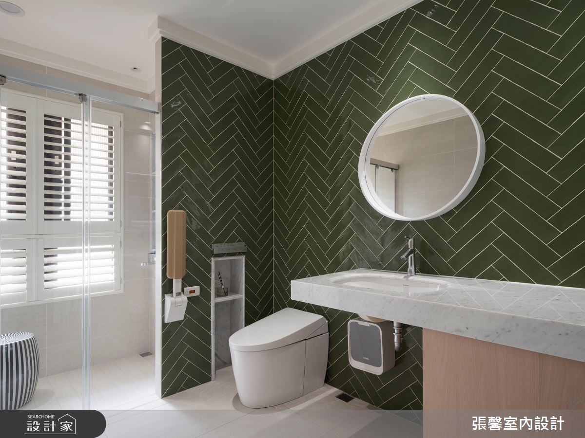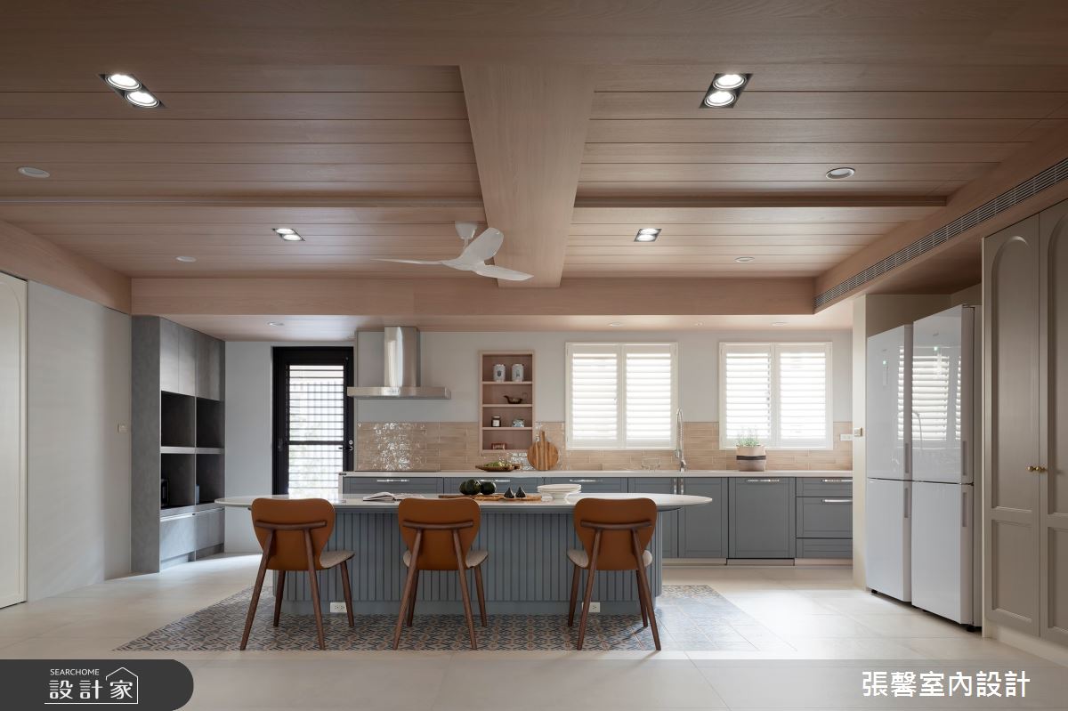 張馨室內設計以油漆、乳膠漆、花磚、壁紙、木地板、鐵件、鍍鈦金屬、木作貼皮、系統板材、大理石、磁磚、木百葉、人造石、賽麗石、石材、線板、噴漆的搭配應用,呈現美式風居家氛圍,將此間64坪、兩房、單層、毛胚屋打造成舒適愜意的家庭空間,完成1位大人的夢想之居。