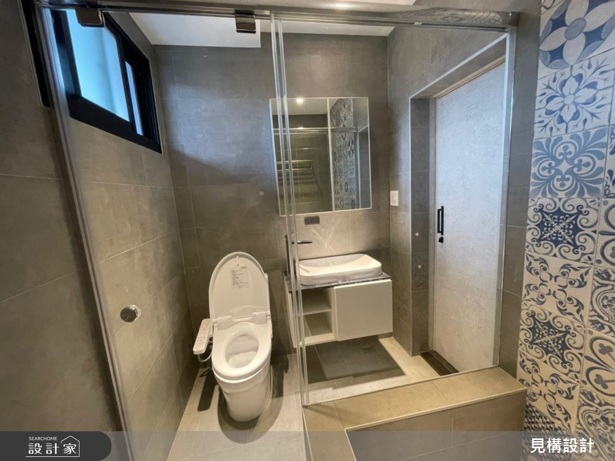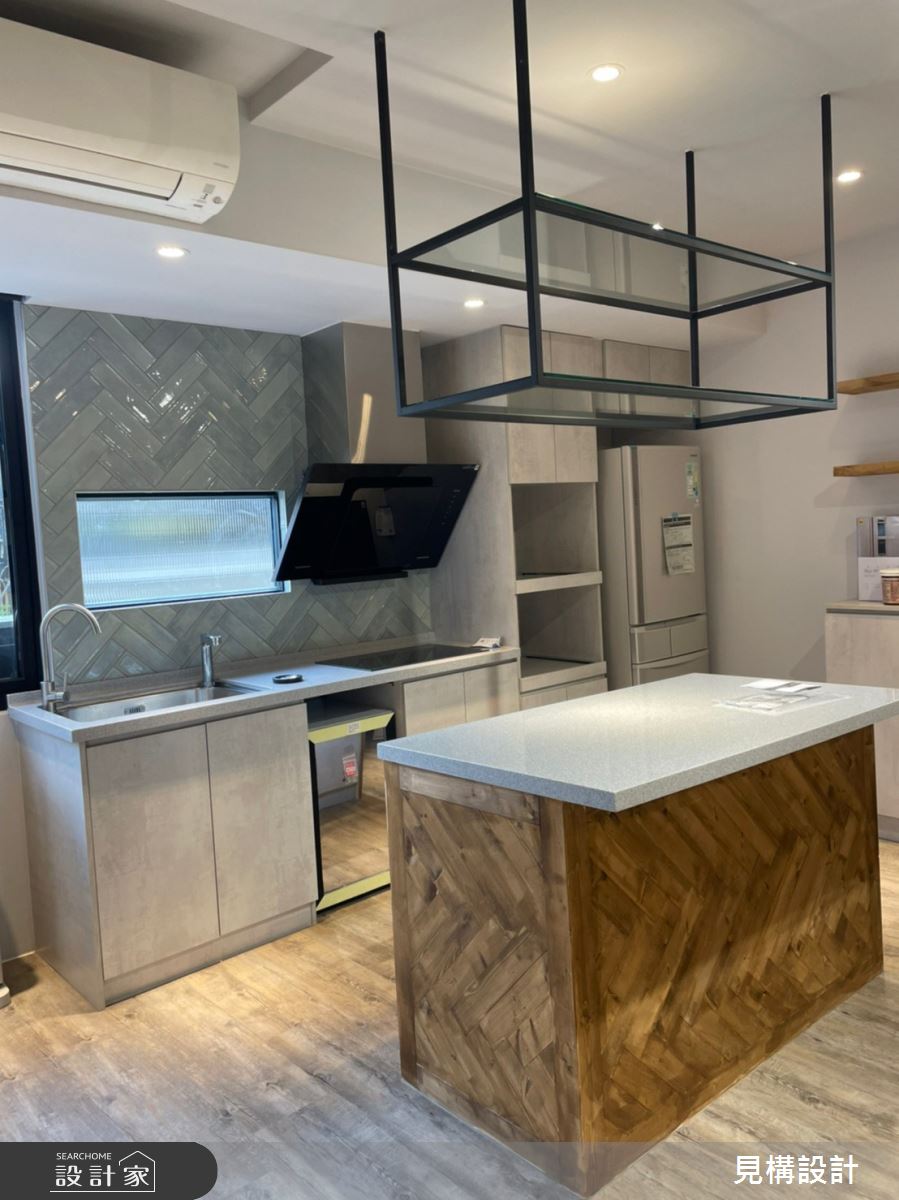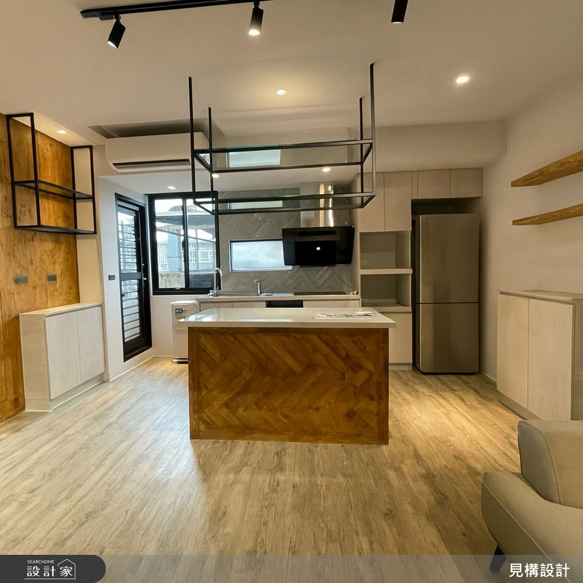見構設計實業有限公司以六角磚/蜂巢磚、水泥漆、SPC地板、鐵件、木作貼皮、磁磚、人造石、軌道燈、實木的搭配應用,呈現工業風居家氛圍,將此間30坪、兩房、單層、老屋(31~40年)打造成舒適愜意的家庭空間,完成2位大人、1位小孩全家人的夢想之居。