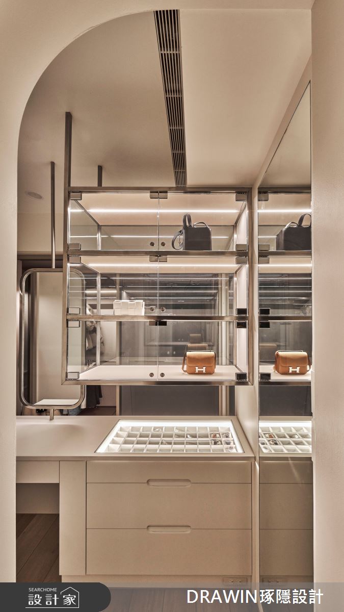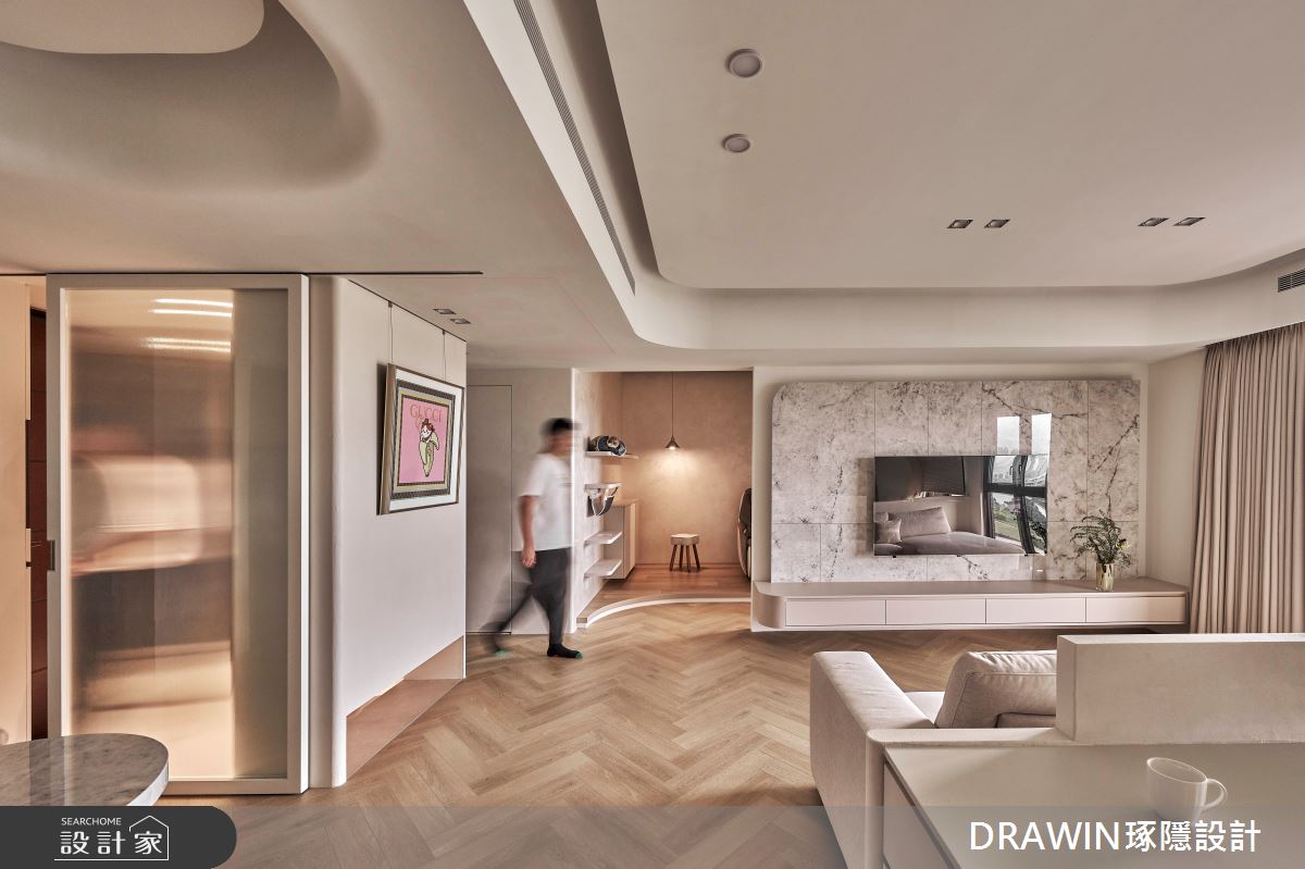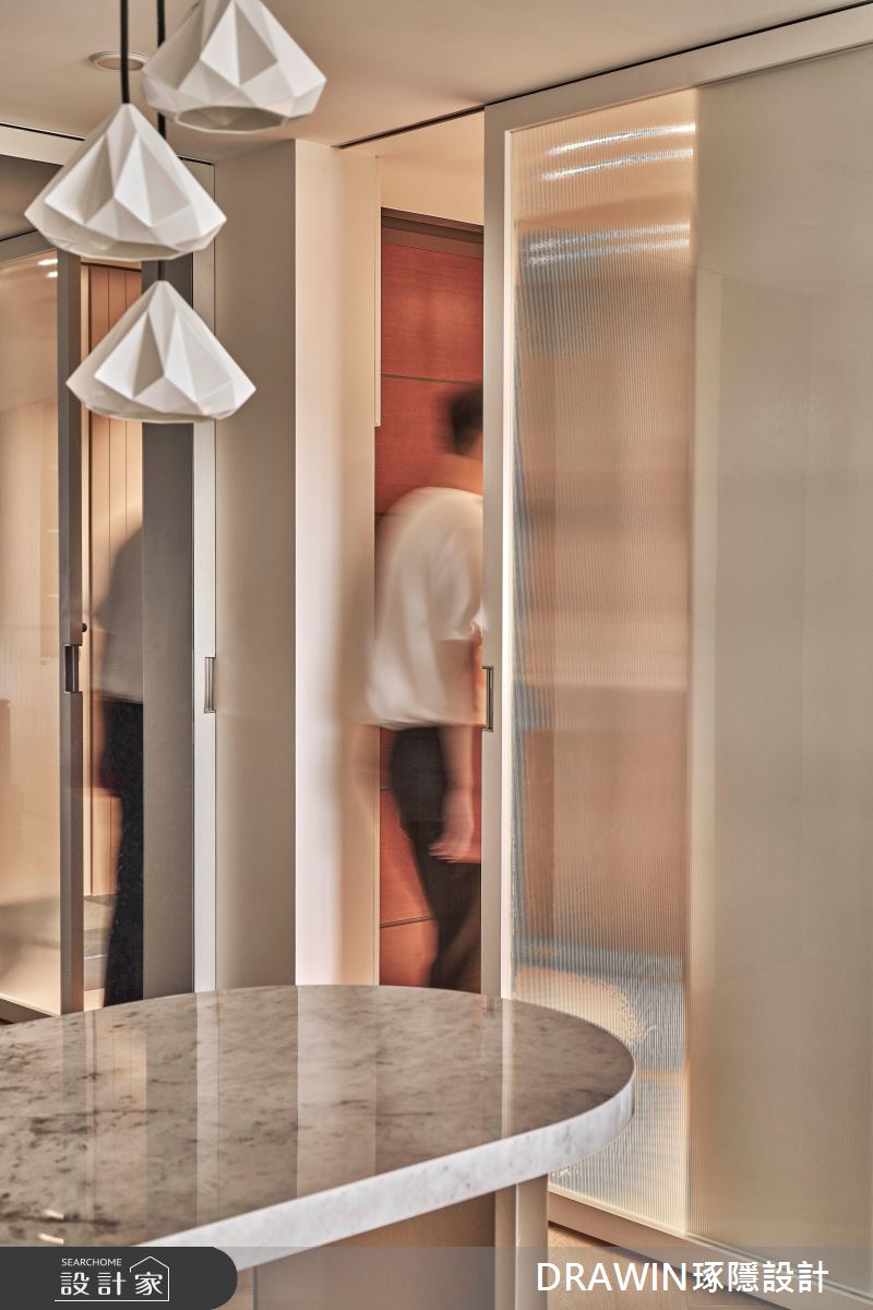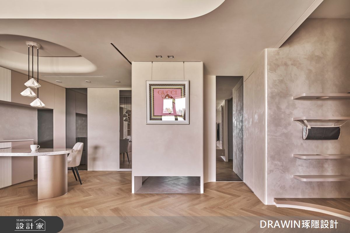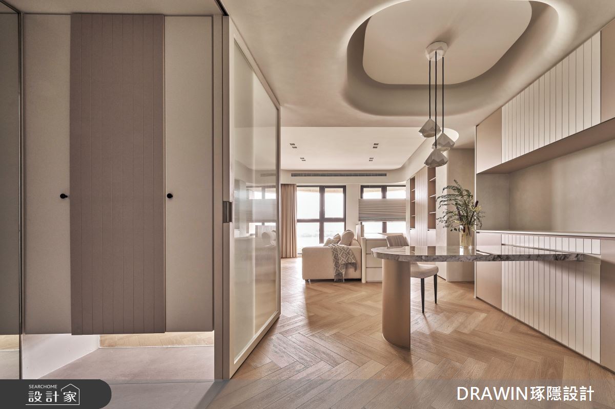 DRAWIN琢隱設計以石材、海島型木地板、長虹玻璃、鐵件、藝術漆的搭配應用,呈現奢華風居家氛圍,將此間32坪、三房、單層、新成屋(5年以下)打造成舒適愜意的家庭空間,完成全家人的夢想之居。