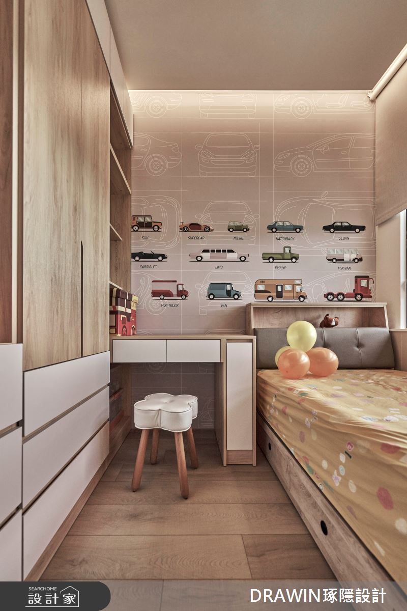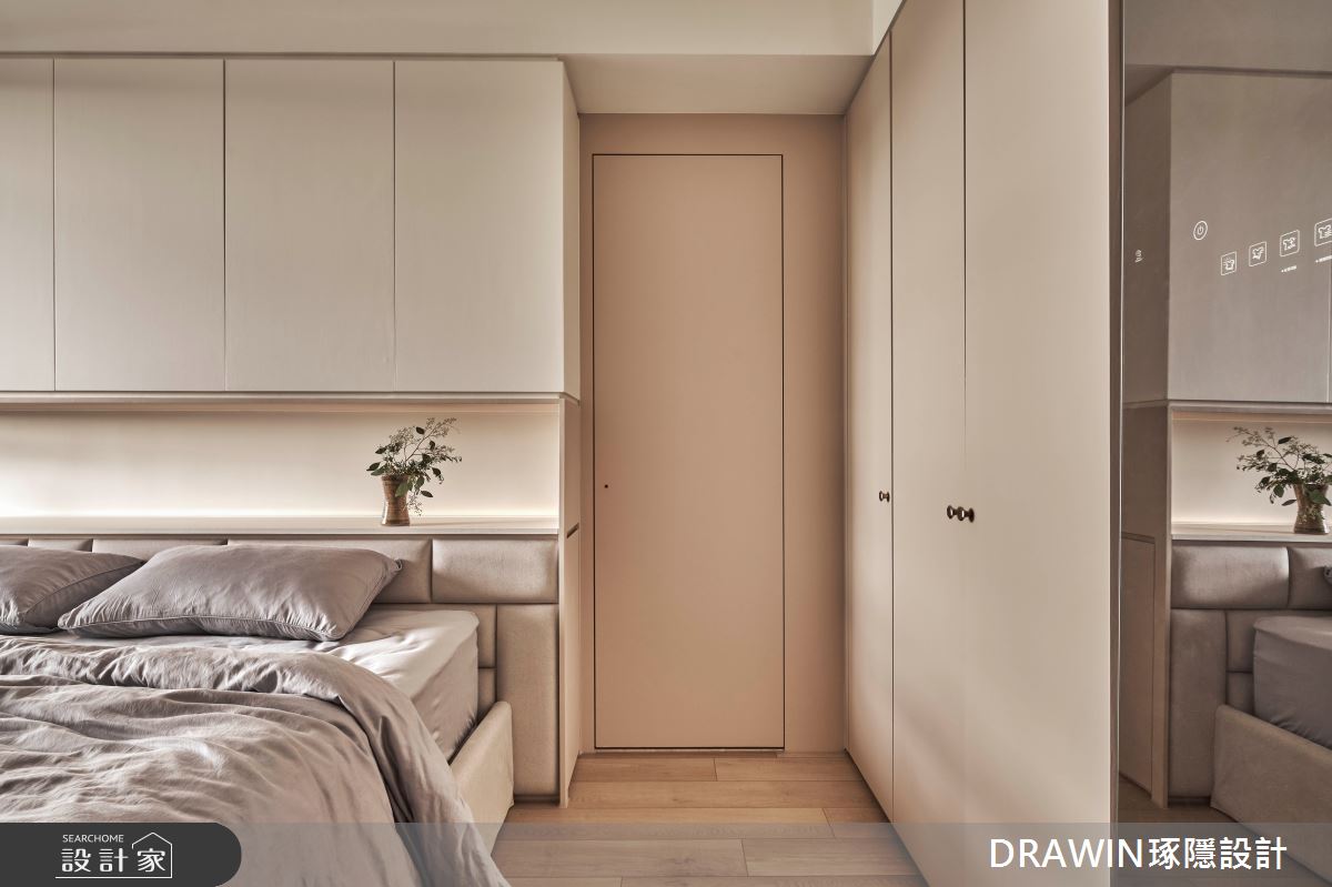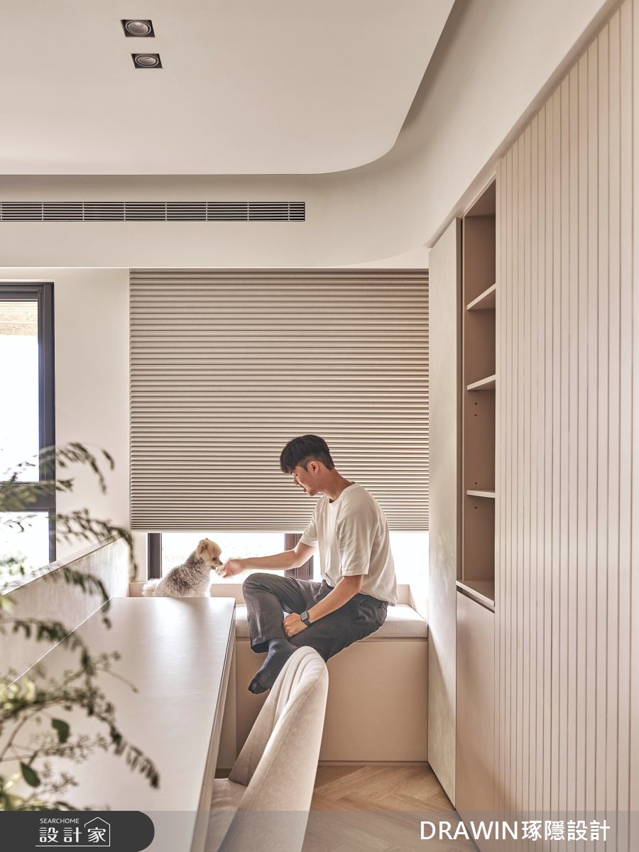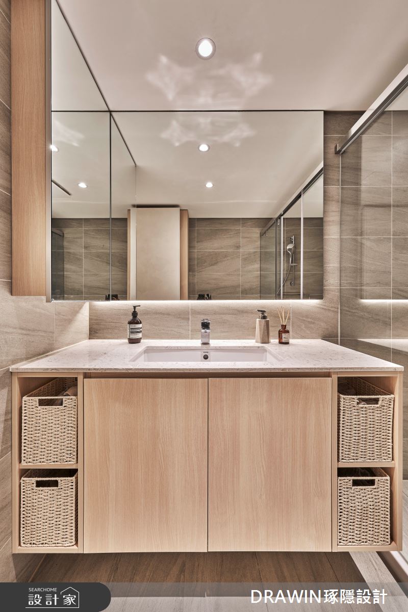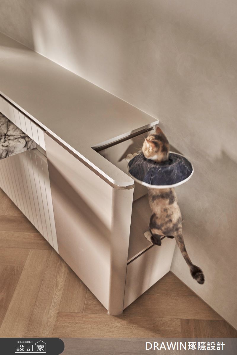 DRAWIN琢隱設計以石材、海島型木地板、長虹玻璃、鐵件、藝術漆的搭配應用,呈現奢華風居家氛圍,將此間32坪、三房、單層、新成屋(5年以下)打造成舒適愜意的家庭空間,完成全家人的夢想之居。