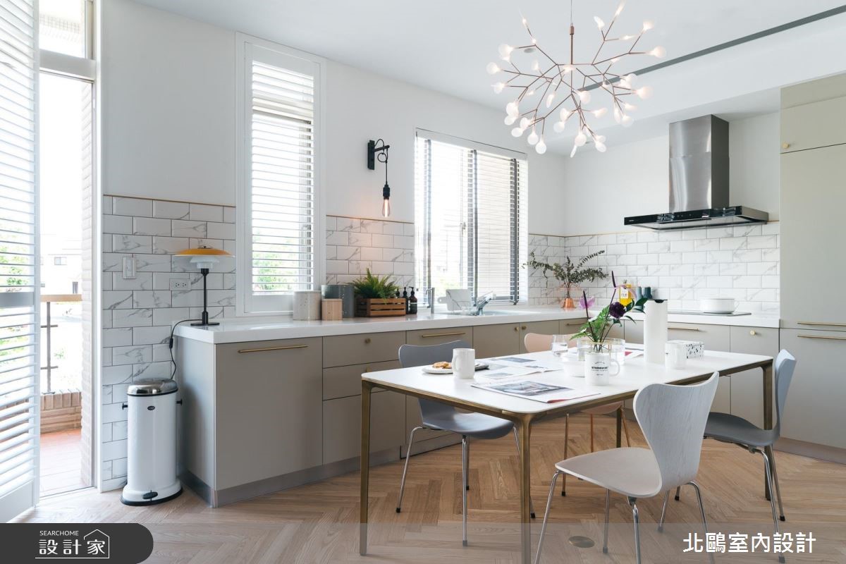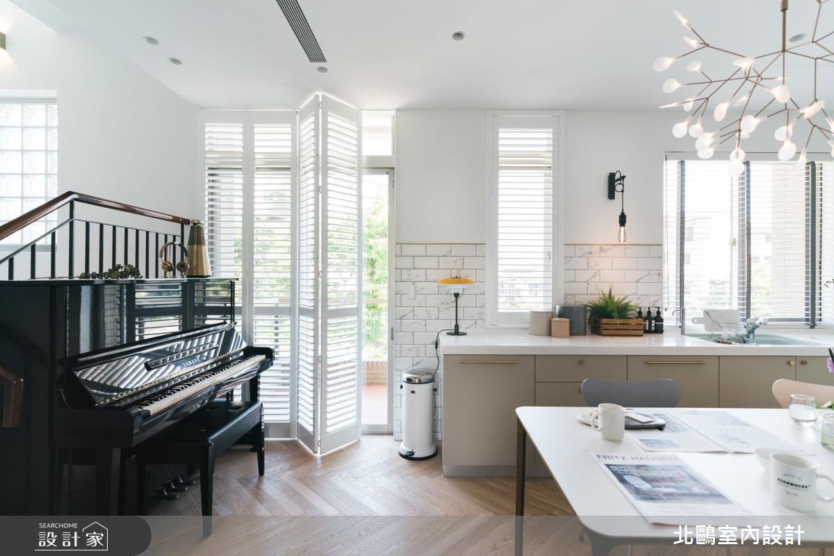 50坪的獨棟別墅居住著一對夫妻及兩個小孩,整個空間的風格以北歐風為主體,簡約、純粹的設計意念,抹去多餘的裝飾,輔以個性化的陳設及綠植注入活力,永續而深刻的點亮平凡、安靜的時刻。 全室鋪上人字拼的木地板,讓整體氛圍柔和舒適,立面以白色為主要色彩,大面積的落地窗讓陽光被最大化的保留,既開展了視覺界面,更為每個角落染上斑斕光彩,成為最無價的裝修,另外,在磁磚計畫上嘗試了多種變化,像是:玄關地坪的蜂巢型花紋地磚、廚房的石紋磁磚、衛浴地坪與立面更運用了兩種不同種類的磁磚拼貼,讓每個場域雖皆為白色的色彩,仍擁有各自的獨特個性。 放淡了天地壁的修飾,設計師通過個性化的陳設及植栽擺設,增加機能性和趣味的觀賞性。寬敞的客廳,精選一組米色系的弧型沙發,可隨需求組合成不同的使用狀態,為生活注入豐富的想像。色彩更是整個家的「活性劑」,客廳使用藍灰色、粉色、灰色的花器點綴,增加生命力;餐廚空間中的餐椅也使用跳色的手法,在精雕細琢的配色中,描繪出愜意舒適的居家品味。 編輯的最愛 利用樓梯旁的畸零角落擺放鋼琴,旁邊的牆面則以圓形鏡面裝飾,讓每個立面都有自己的表情,讓人能恣意享受在家的質感時光。