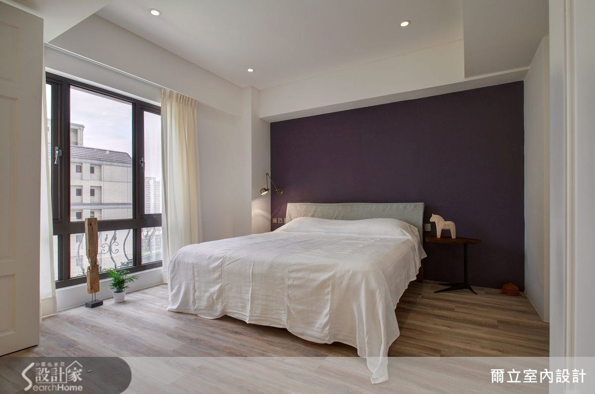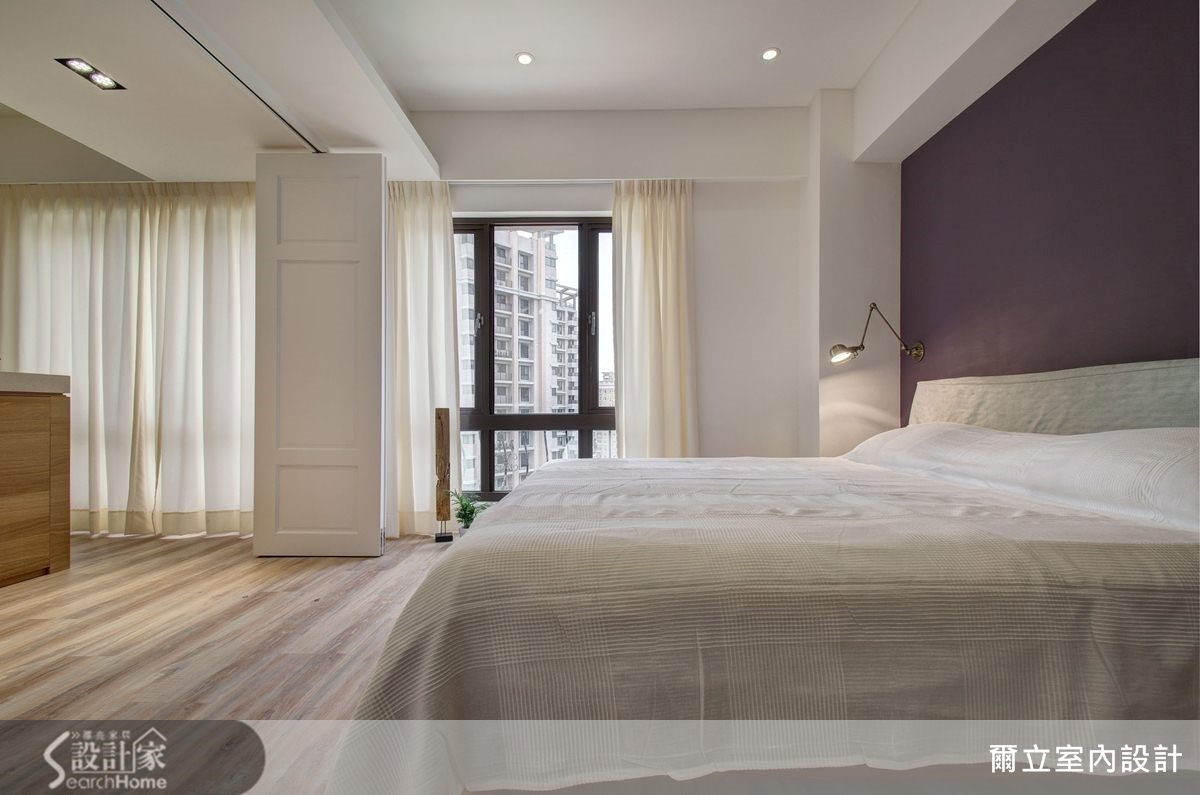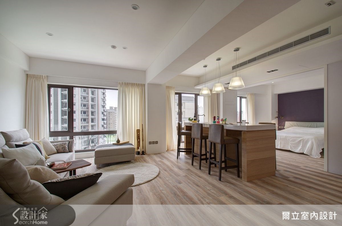 本案位於新北市林口,為21 坪中古屋單身宅,原先整體格局顯得狹小零碎,設計師將格局打通,形成開放式居宅,並注入飯店客房般的舒適概念,藉由大面窗戶引進充裕採光,讓明亮感流通全室,並以超耐磨木地板鋪陳整個地坪,打造溫潤的居住氛圍,客廳則採用六盞嵌燈,展現明亮溫馨感;並在空間中央配置用餐兼工作區,透過吧檯式餐桌做為區域之間的分隔界定,並考量到隱私需求,採可自由開闔的實木門板為主臥門片,讓整個家在全開、半開或遮蔽之間,得到最彈性的運用;臥房空間運用淺色調打造休閒風格,並在床頭牆上漆上飽滿的紫色,成為畫龍點的視覺亮點,同時也添加浪漫的寢臥風情;衛浴牆面使用義大利無修邊磚,營造具個性感的 LOFT 風格,讓洗浴空間也能別具質感。