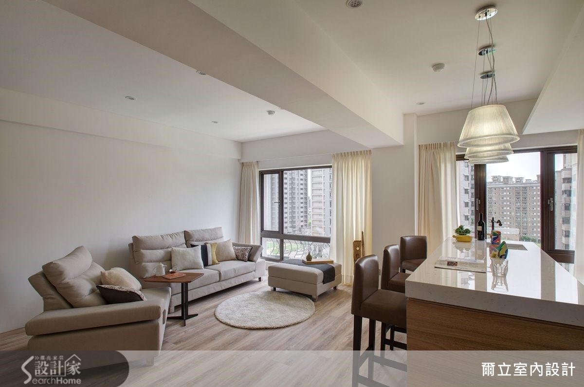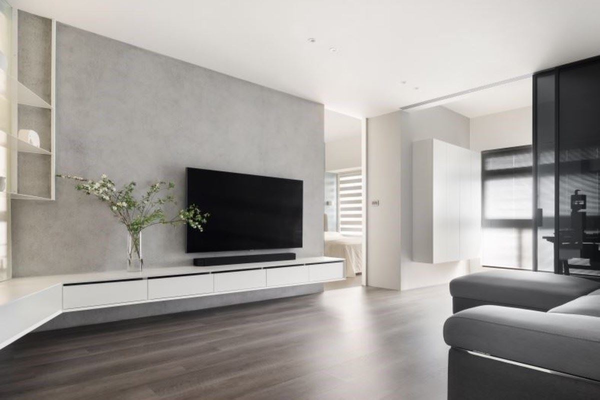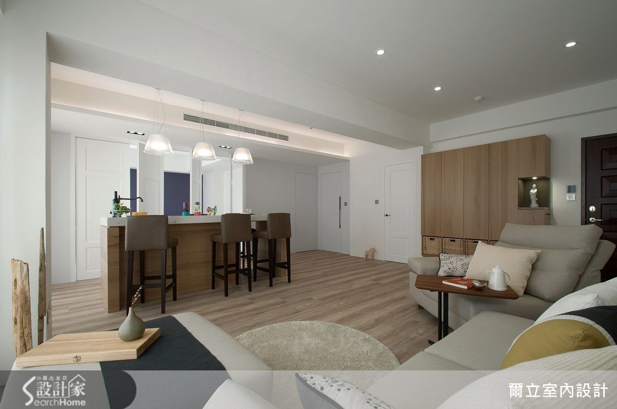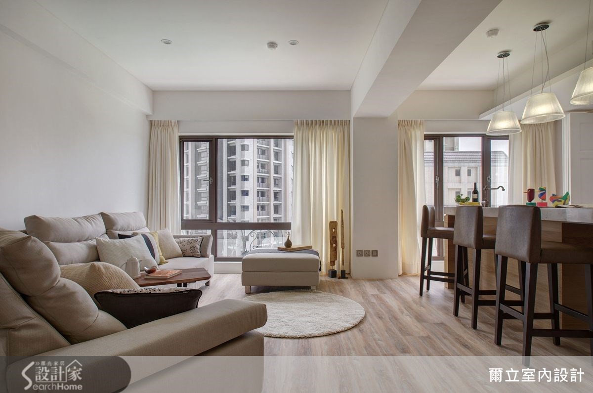 本案位於新北市林口,為21 坪中古屋單身宅,原先整體格局顯得狹小零碎,設計師將格局打通,形成開放式居宅,並注入飯店客房般的舒適概念,藉由大面窗戶引進充裕採光,讓明亮感流通全室,並以超耐磨木地板鋪陳整個地坪,打造溫潤的居住氛圍,客廳則採用六盞嵌燈,展現明亮溫馨感;並在空間中央配置用餐兼工作區,透過吧檯式餐桌做為區域之間的分隔界定,並考量到隱私需求,採可自由開闔的實木門板為主臥門片,讓整個家在全開、半開或遮蔽之間,得到最彈性的運用;臥房空間運用淺色調打造休閒風格,並在床頭牆上漆上飽滿的紫色,成為畫龍點的視覺亮點,同時也添加浪漫的寢臥風情;衛浴牆面使用義大利無修邊磚,營造具個性感的 LOFT 風格,讓洗浴空間也能別具質感。