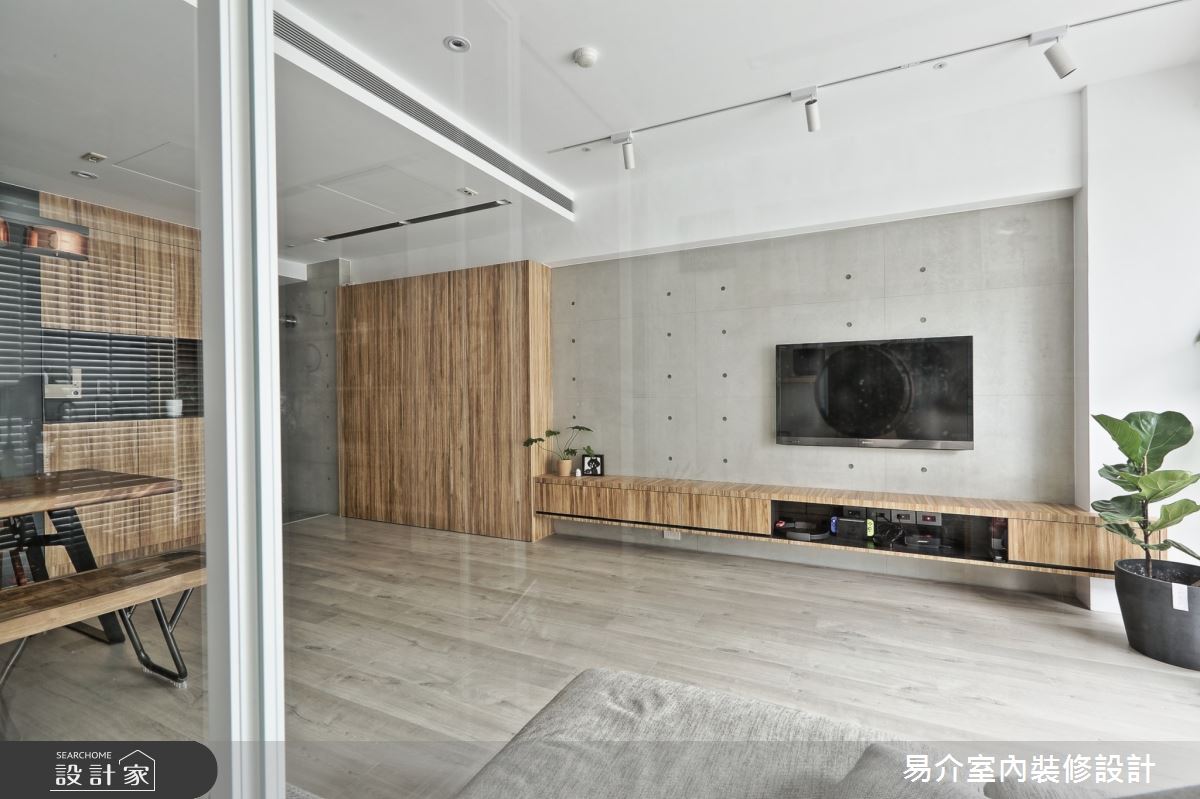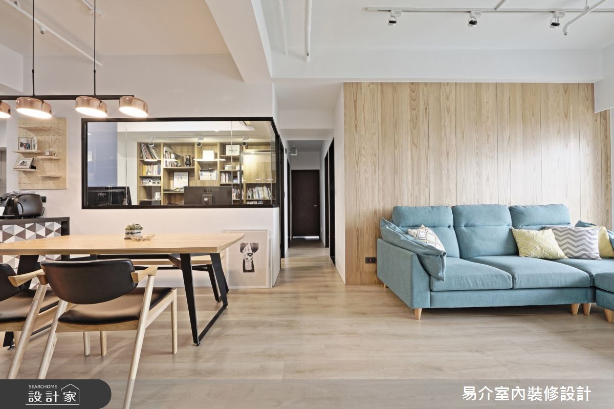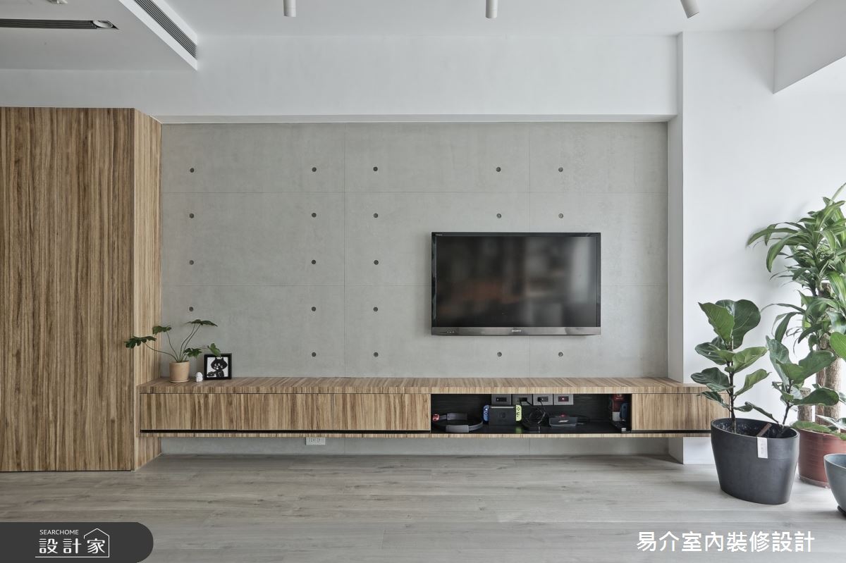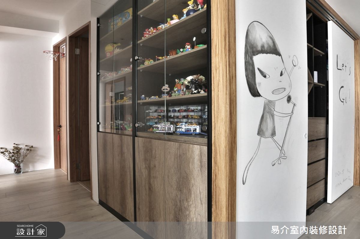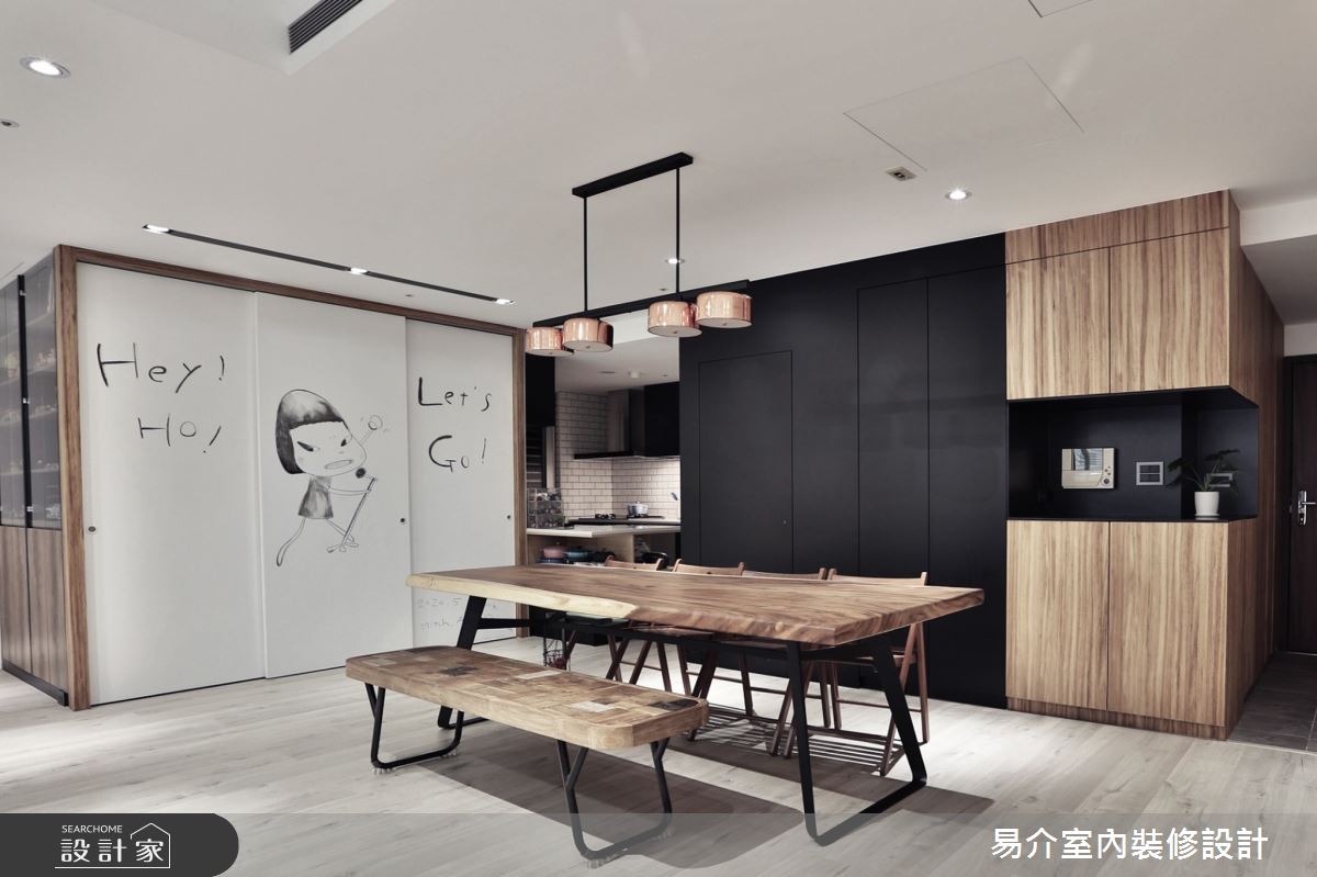 由易介室內裝修設計精心規劃的35坪四房住宅空間,家庭成員一共有2位大人、2位小孩。因應屋主需求,設計師運用現代風作為主軸,搭配乳膠漆、花磚、壁紙、超耐磨木地板、木地板、鐵件、烤玻、木作貼皮、烤漆、水泥/水泥粉光、軌道燈、珪藻土,打造全家人的夢想家居。