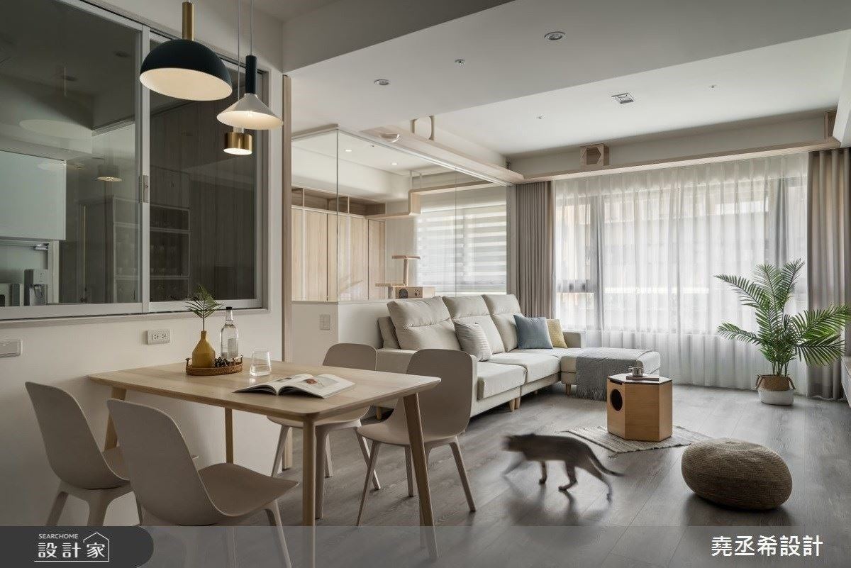 堯丞希設計以木地板、噴漆、木皮、金屬、玻璃的搭配應用,呈現現代北歐居家氛圍,將此間32坪、三房、單層、新成屋(5年以下)打造成舒適愜意的家庭空間,完成全家人的夢想之居。
