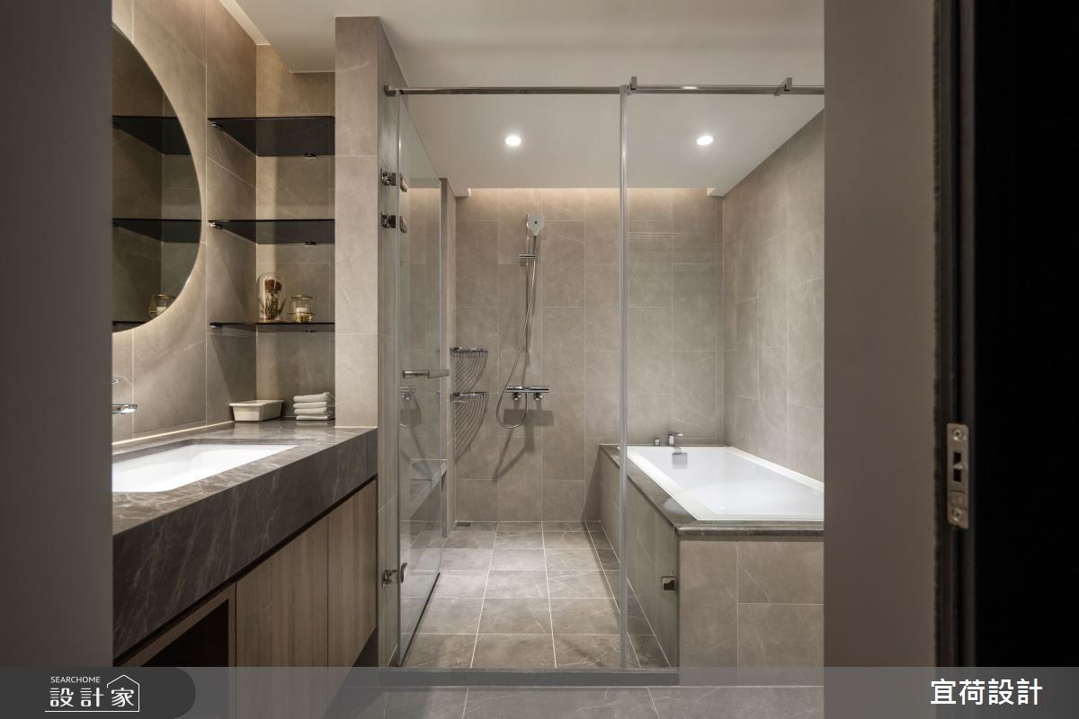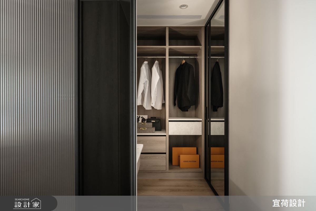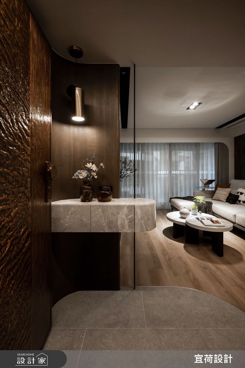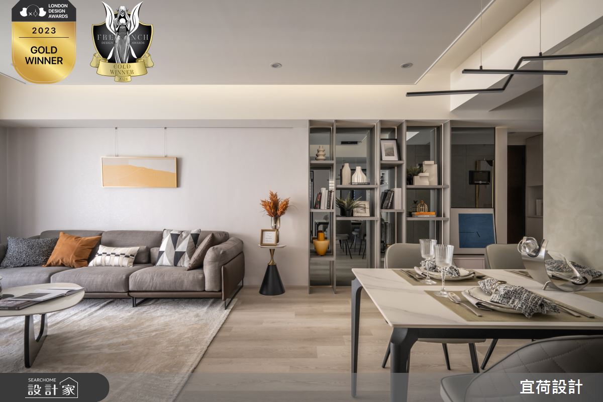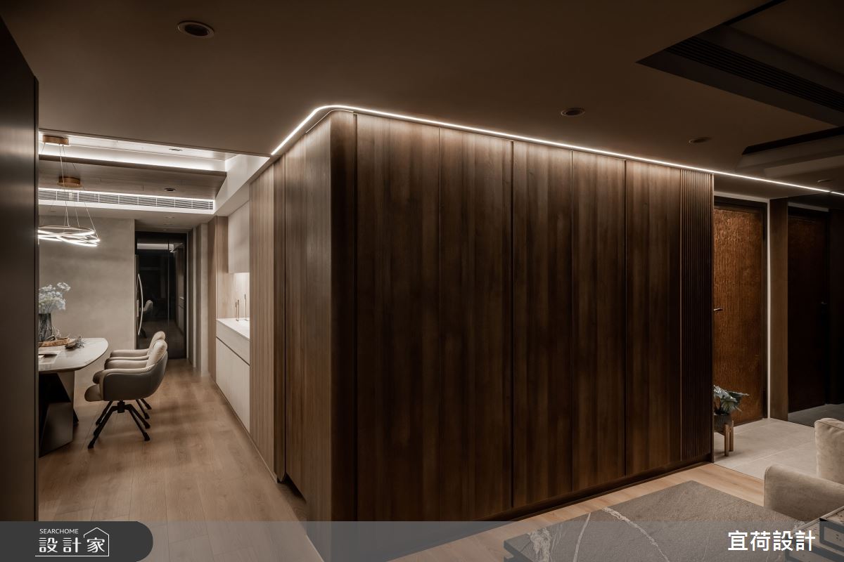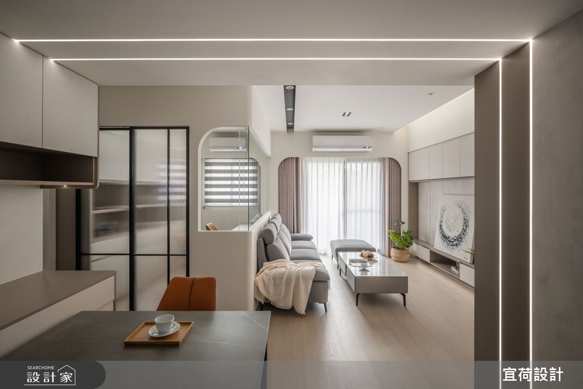 宜荷設計以乳膠漆、SPC超耐磨木地板、石英磚/拋光石英磚、鐵件、灰鏡、木作貼皮、烤漆、鋼刷木皮、系統板材、賽麗石、線型燈、石材、噴漆、司曼特特殊漆的搭配應用,呈現現代風居家氛圍,將此間38坪、三房、單層、新古屋(10年以下)打造成舒適愜意的家庭空間,完成2位大人、1位小孩全家人的夢想之居。