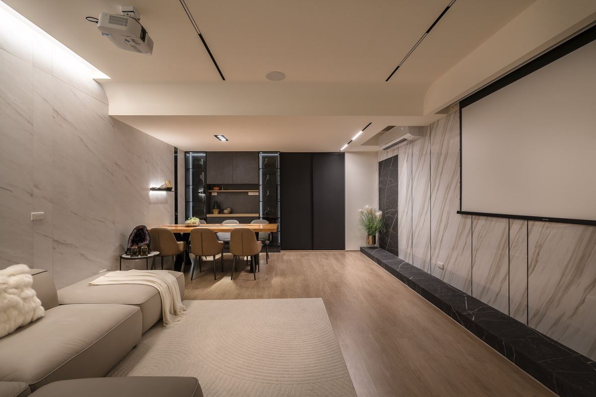 以現代風為基底的複層住宅,以純白大理石與深邃的鋼刷木皮色調,展現時髦大器的風格美學,並因應三代同堂的生活機能需求,設計師打造了開闊舒適的公領......