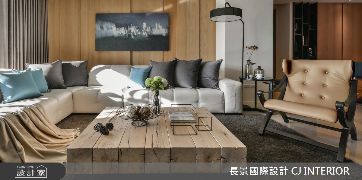 長景國際設計以油漆、乳膠漆、壁紙、木地板、不鏽鋼、鐵件、烤玻、鍍鈦金屬、木作貼皮、烤漆、鋼刷木皮、系統板材、大理石、磁磚、人造石、賽麗石、皮革、石材、繃布、噴漆、噴砂玻璃的搭配應用,呈現現代風居家氛圍,將此間75坪、三房、單層、新成屋(5年以下)打造成舒適愜意的家庭空間,完成2位大人、1位小孩全家人的夢想之居。