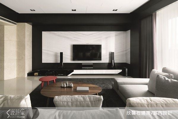 客廳與書房空間皆作開放式設計,搭配明亮的採光提升了空間的光感,一個遼闊的空間感。雪白銀狐大理石製作而成的電視牆面,對稱的...