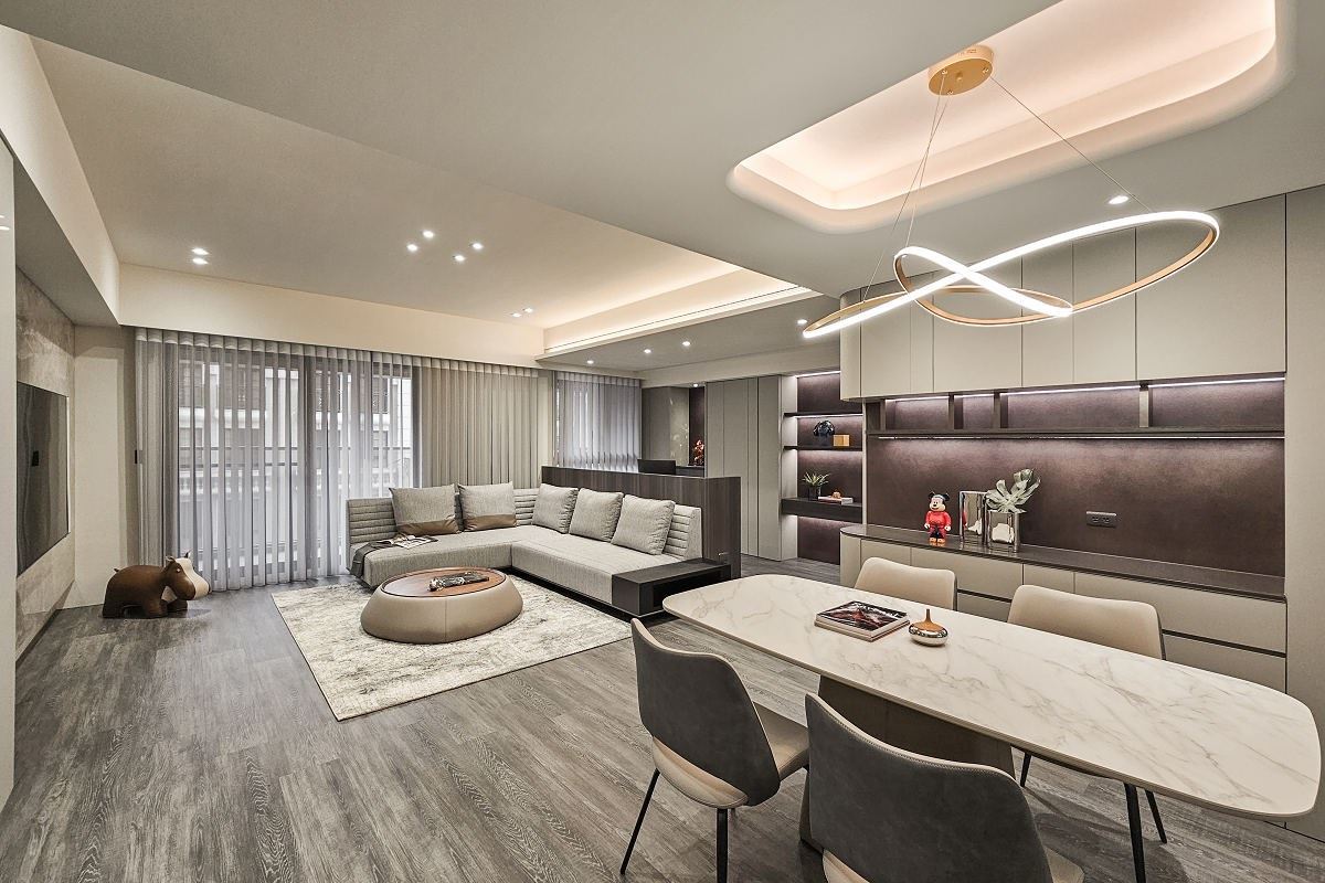 導弧語彙化解風水疑慮,燕麥色美型櫃體挹注細膩,造型懸掛燈飾奠定用餐儀式