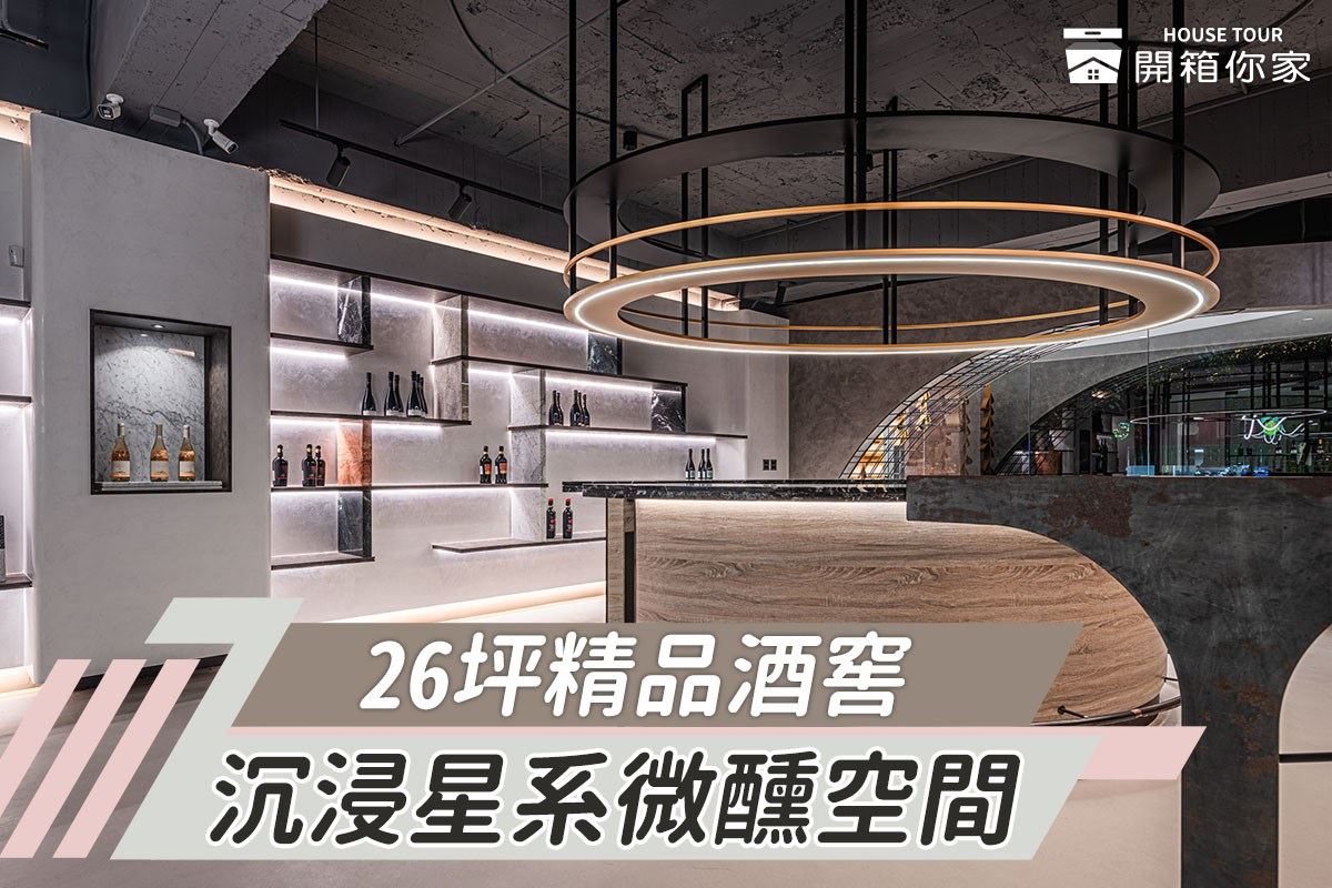 40年老屋翻新26坪現代風精品酒窖,天然大理石搭配粗曠的特殊漆與鐵件,無重力懸浮桌,以宇宙星系概念打造閃耀奢華微醺空間,創造出獨一無二的品酒空間