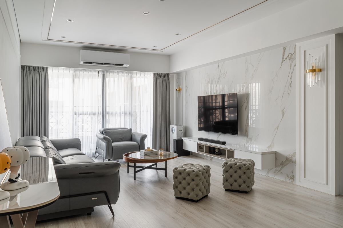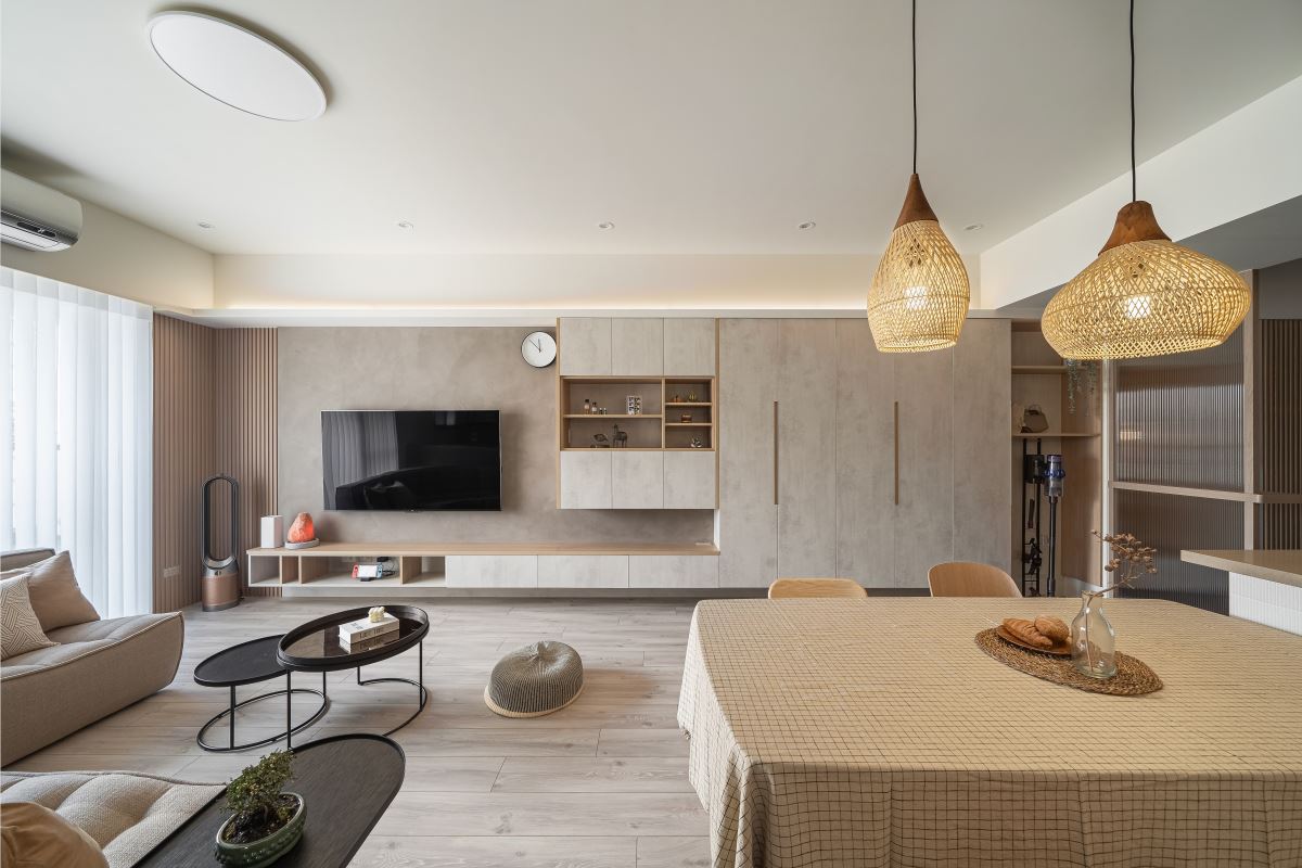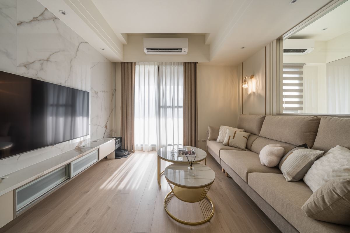 王亭今設計師為19坪小宅空間注入現代風元素,以奶茶色鋪陳,點綴線板、石材、燈具,...