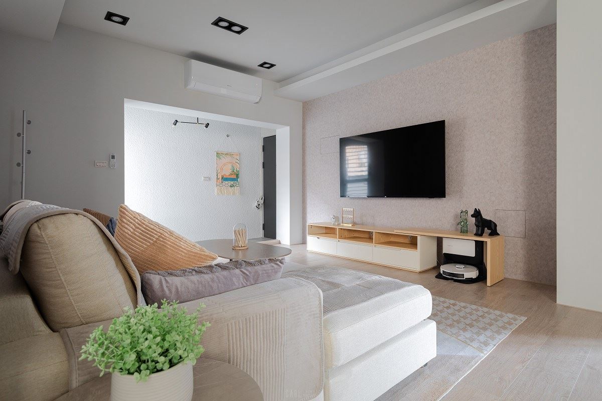 原狹長陽台分區規劃,造型花磚界定落塵區,移除舊有落地窗打造視覺框景