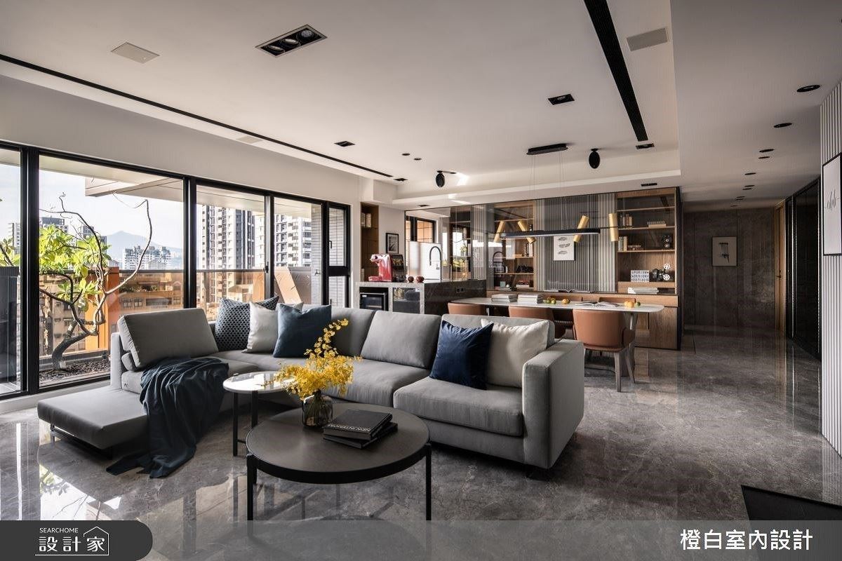 55坪單層住宅,挹注優雅低調的大理石材,從地坪、電視主牆一路延伸至中島櫃體,混搭...