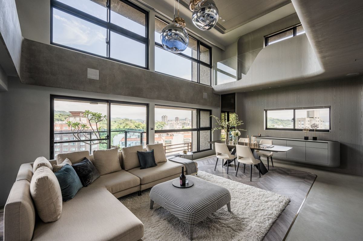 李建勳設計師根據屋主生活需求,為55坪的毛胚屋打造1房2廳2衛的格局,採用自由靈...
