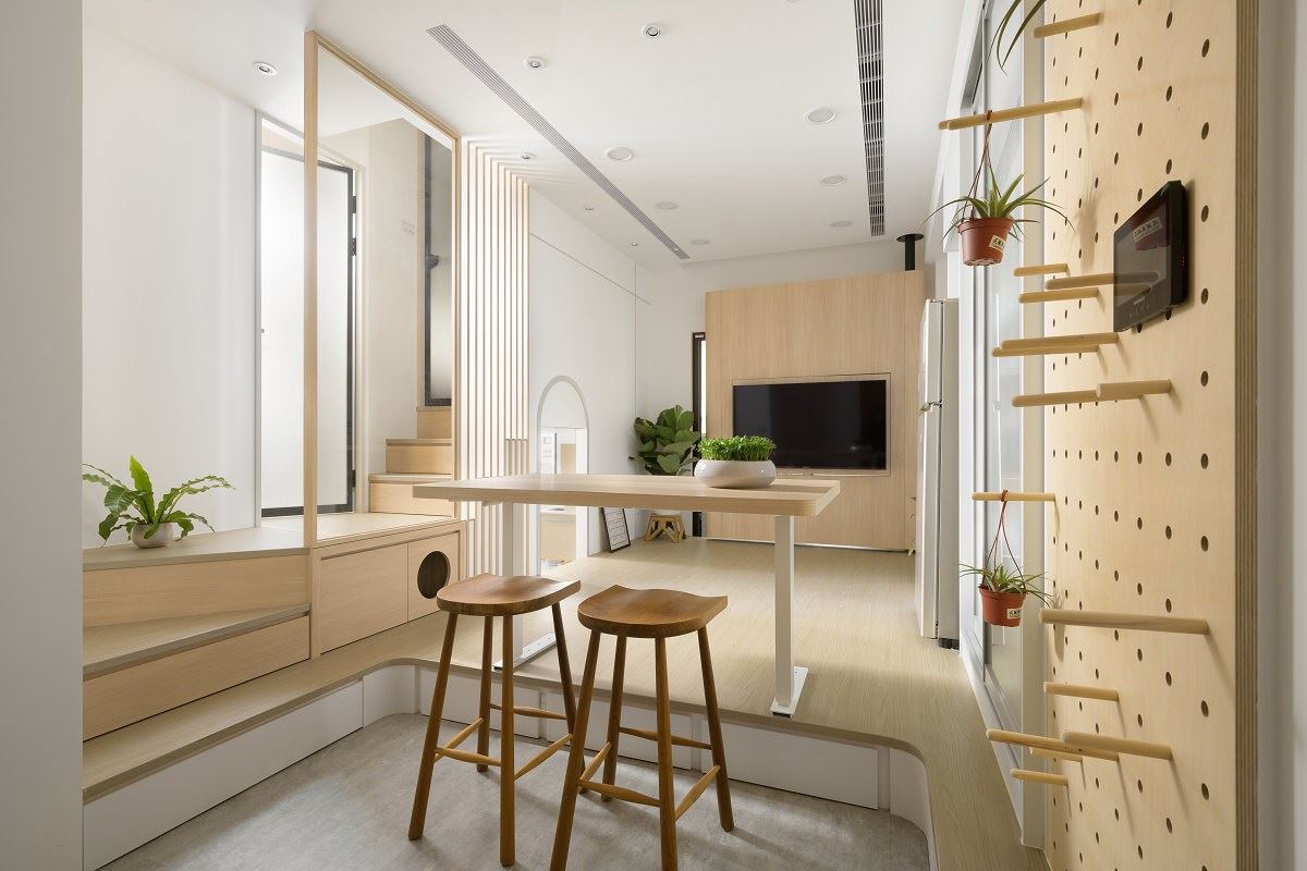 力求寬裕的生活空間,有收納和洞洞板機能,藉由高低差創造落塵區