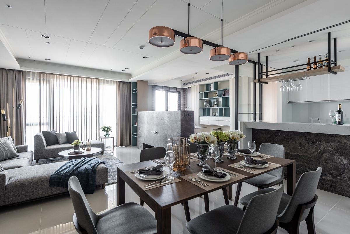 一家四口入住52坪新古典美式宅,空間色彩以黑白灰三色為基底,以多種材質堆疊豐富的...