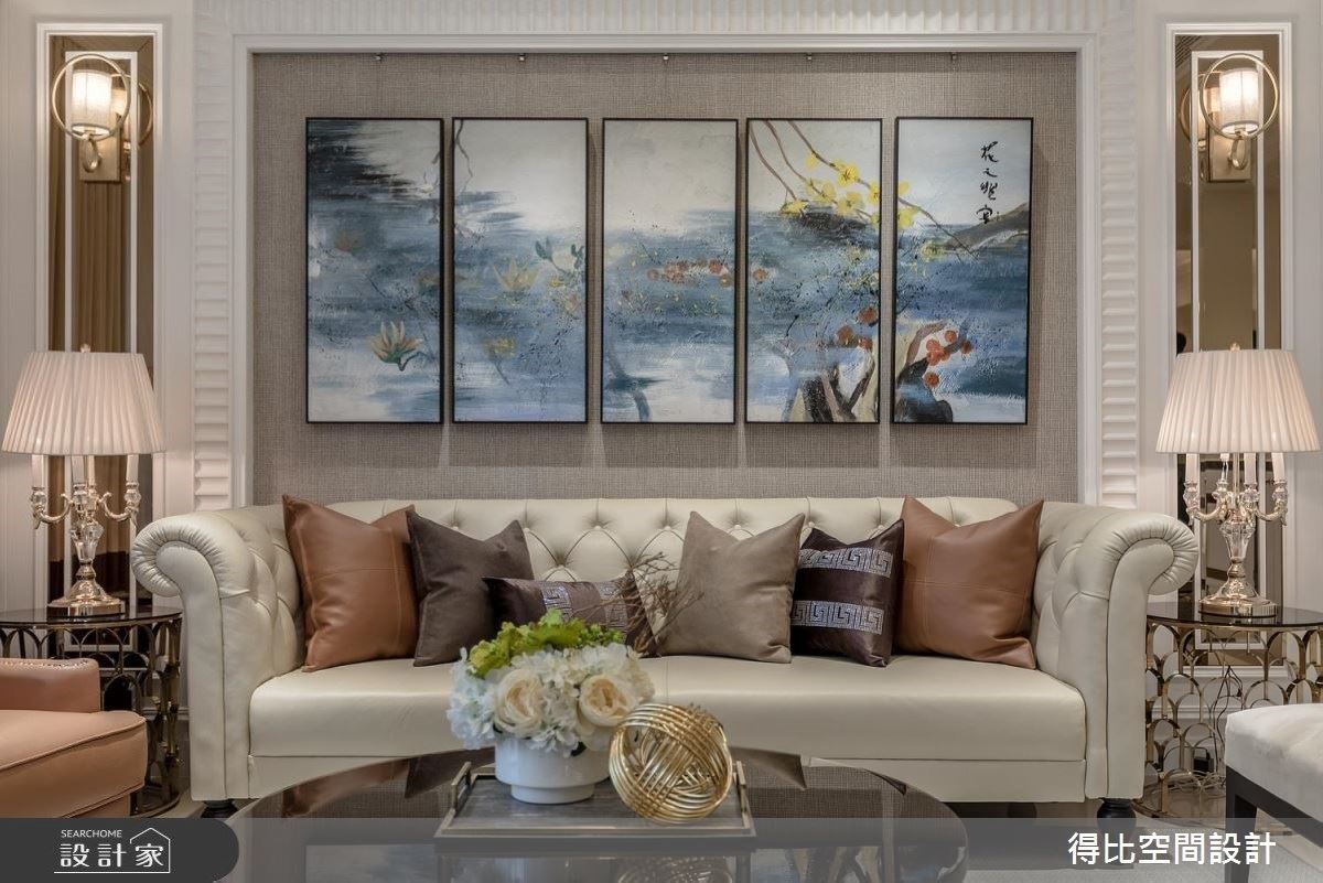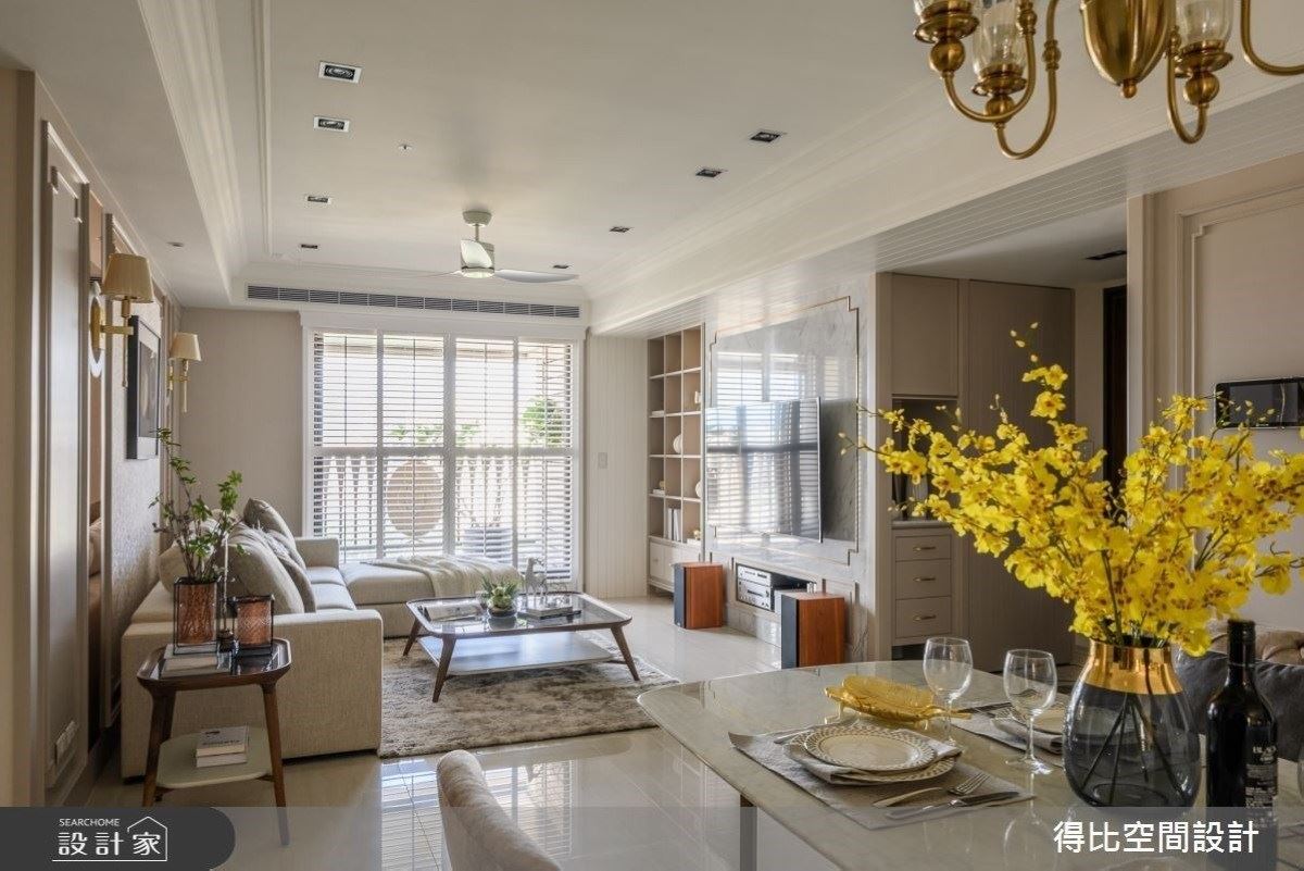 36坪美式新古典風,以溫柔杏調為空間主色,牆面搭佐線板元素,營造出滿室的細膩感與...