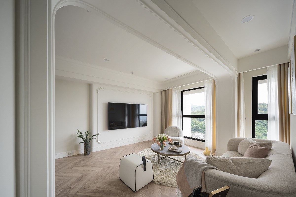 花磚、古典線板構築典雅玄關,弧形拱門挹注異國情調,半高電視牆創造回字動線,對稱的...