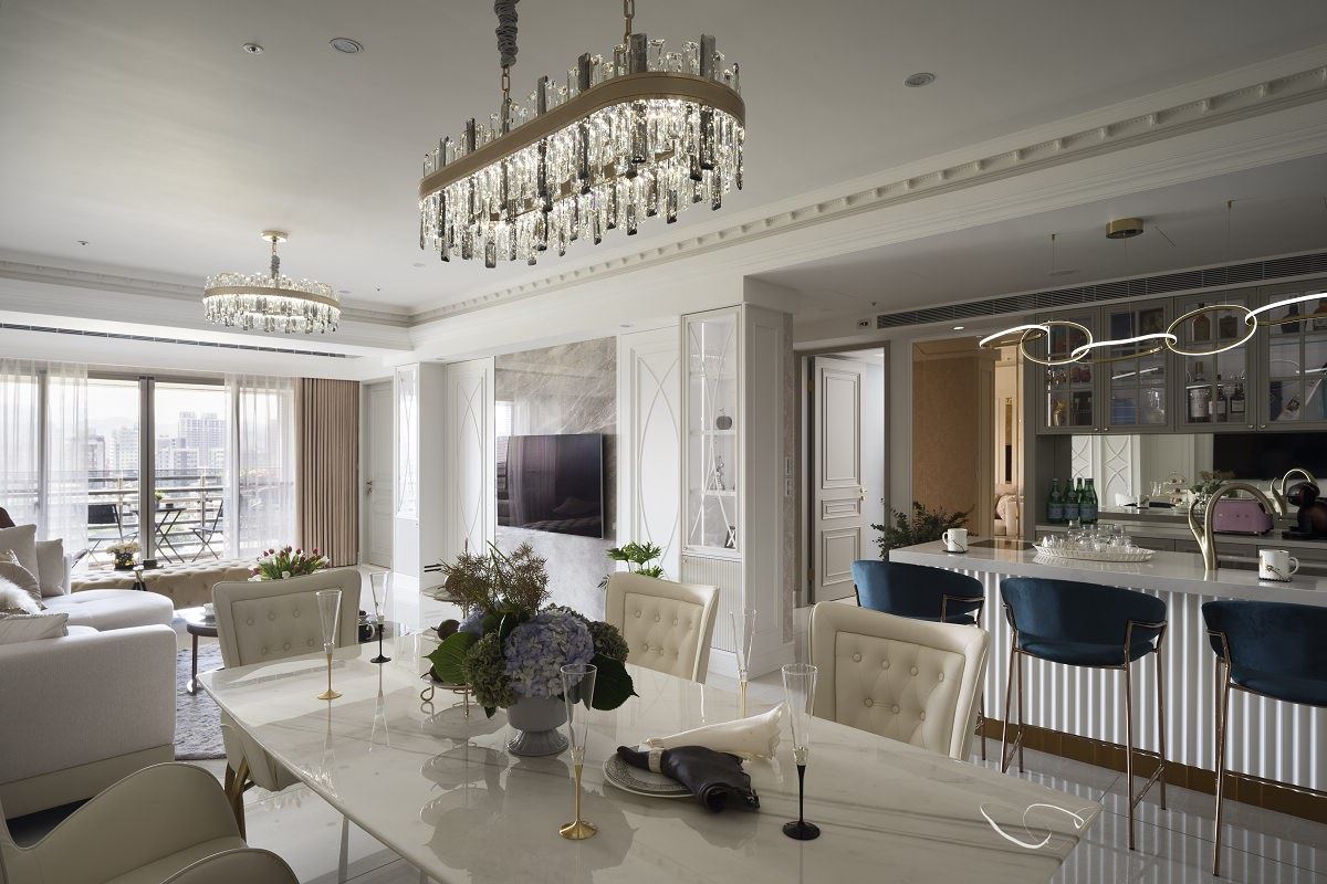 花磚、古典線板構築典雅玄關,弧形拱門挹注異國情調,半高電視牆創造回字動線,對稱的...