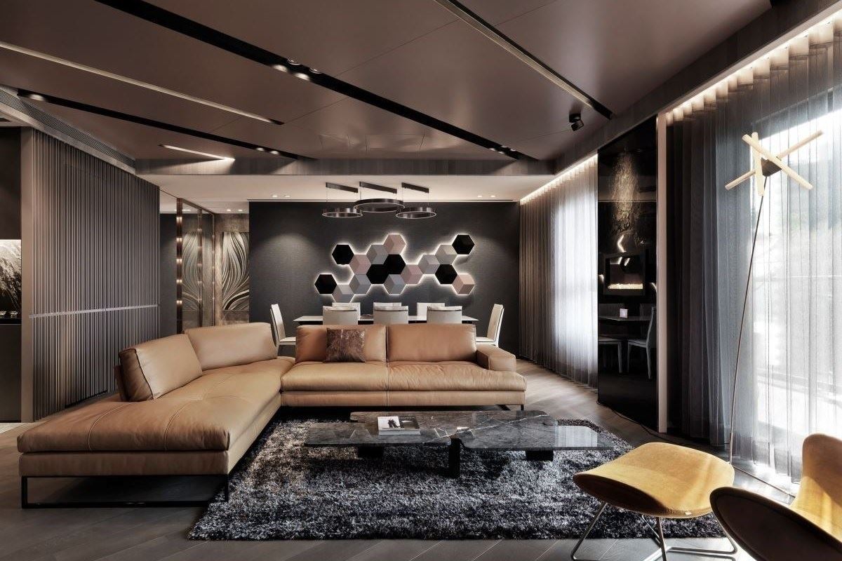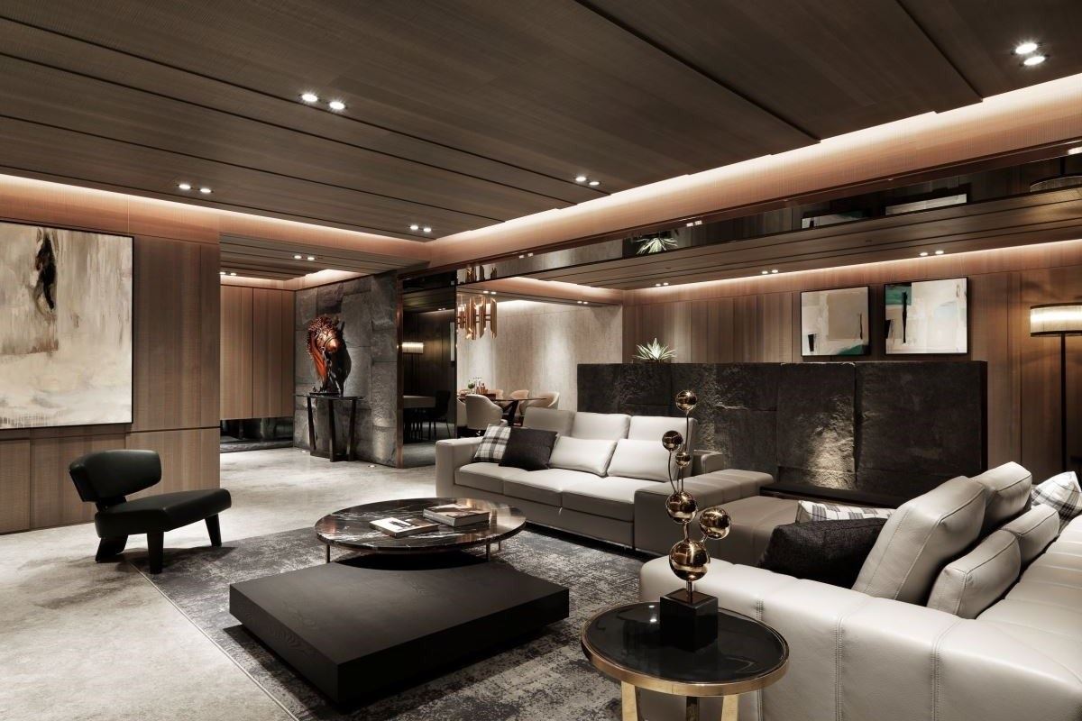 鄭錦鵬設計師運用石紋拼搭百坪豪宅大器尺度,透過深色木皮櫃體鋪排延續至天花板,平衡...