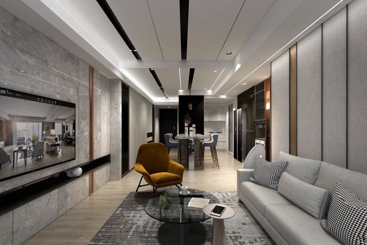 39 坪現代風住宅以高尚內斂的灰白色系,作為空間主視覺,並混搭金屬鈦絲紋板、皮革...