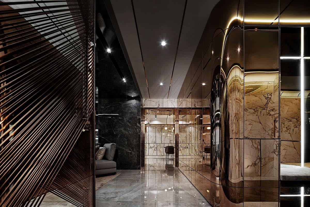 翁嘉鴻設計師透過視覺空間感的設計,搭配材質運用,在90坪的空間打造出光影流動的現...