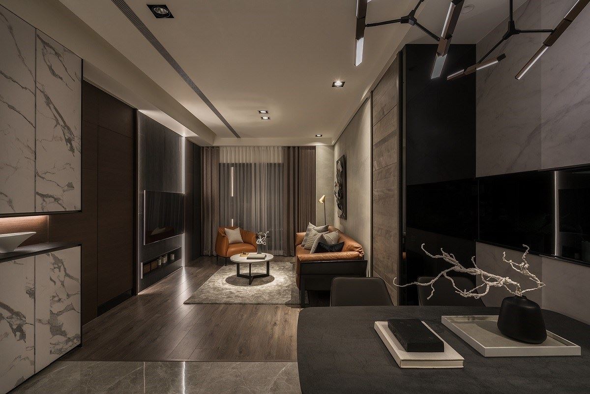 56坪的居宅,設計師依屋主喜愛的深色調,微調格局並放大地坪,利用多元材質與色彩,...
