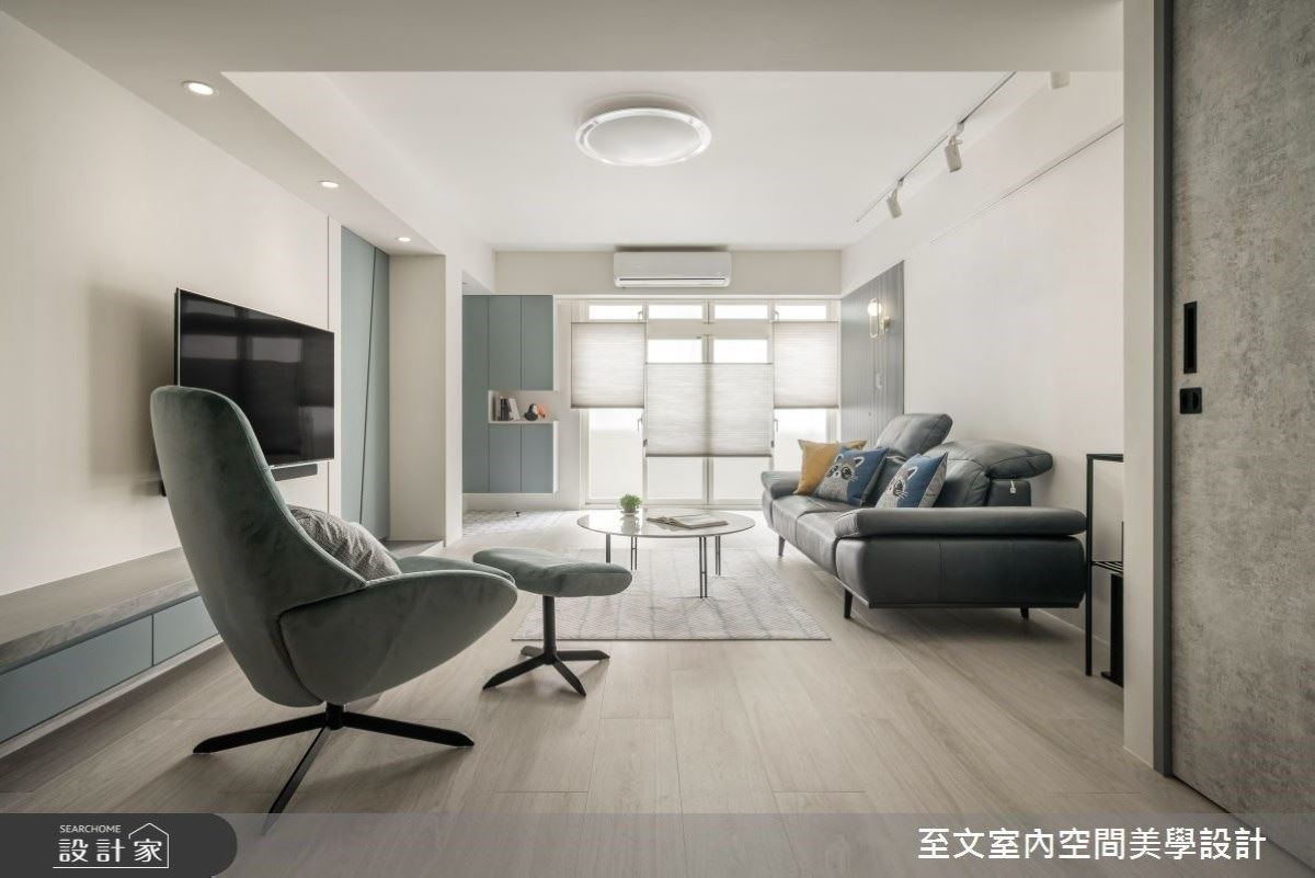 此案為35坪的老屋翻新,透過白色為基底,拉闊空間視野;灰色系搭配清爽湖水藍,展現...