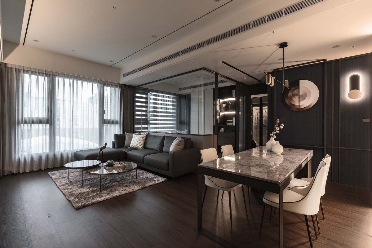 由鋼刷木皮、大理石和進口系統板詮釋沈穩的現代風格並打造玻璃書房、鋪貼幾何布紋磚,...