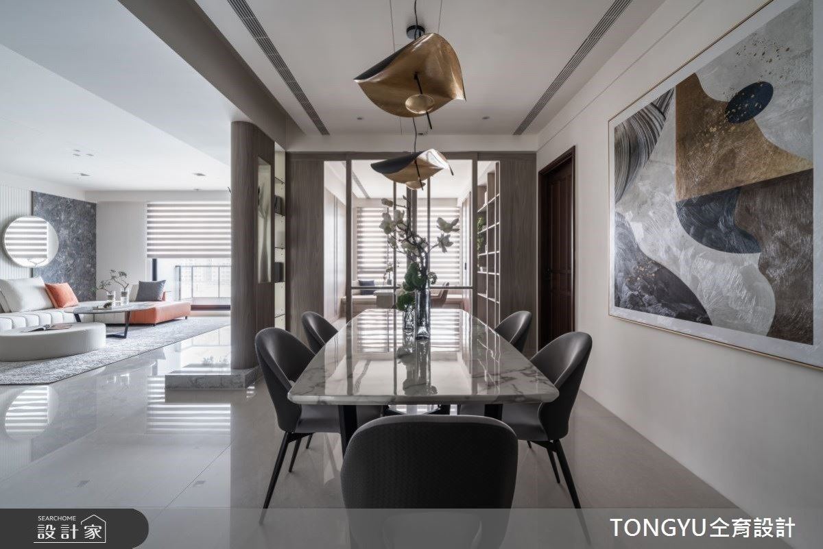 面對近300坪的大空間,以簡約、清爽為主題,全屋採用低彩度色調作延伸。 客餐廳、...
