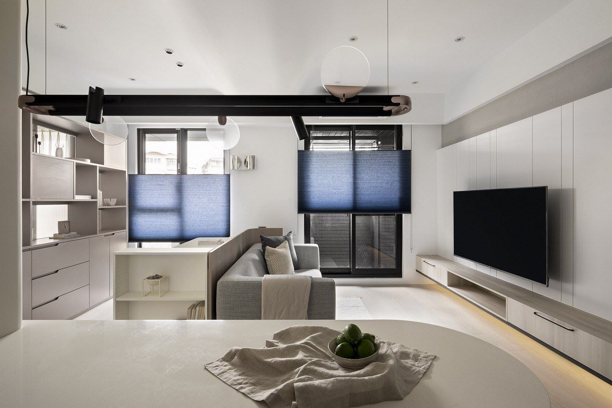 10坪一房兩廳的北歐風新成屋,居住成員為一對夫妻,使用透光材質與拉簾,化解開門見...