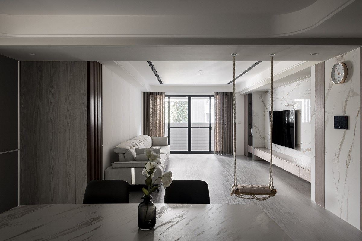 玄關包含儲藏室增加垂直收納,天花大樑設計後界定客餐廳,柔和色調弧形線條交織溫馨優...