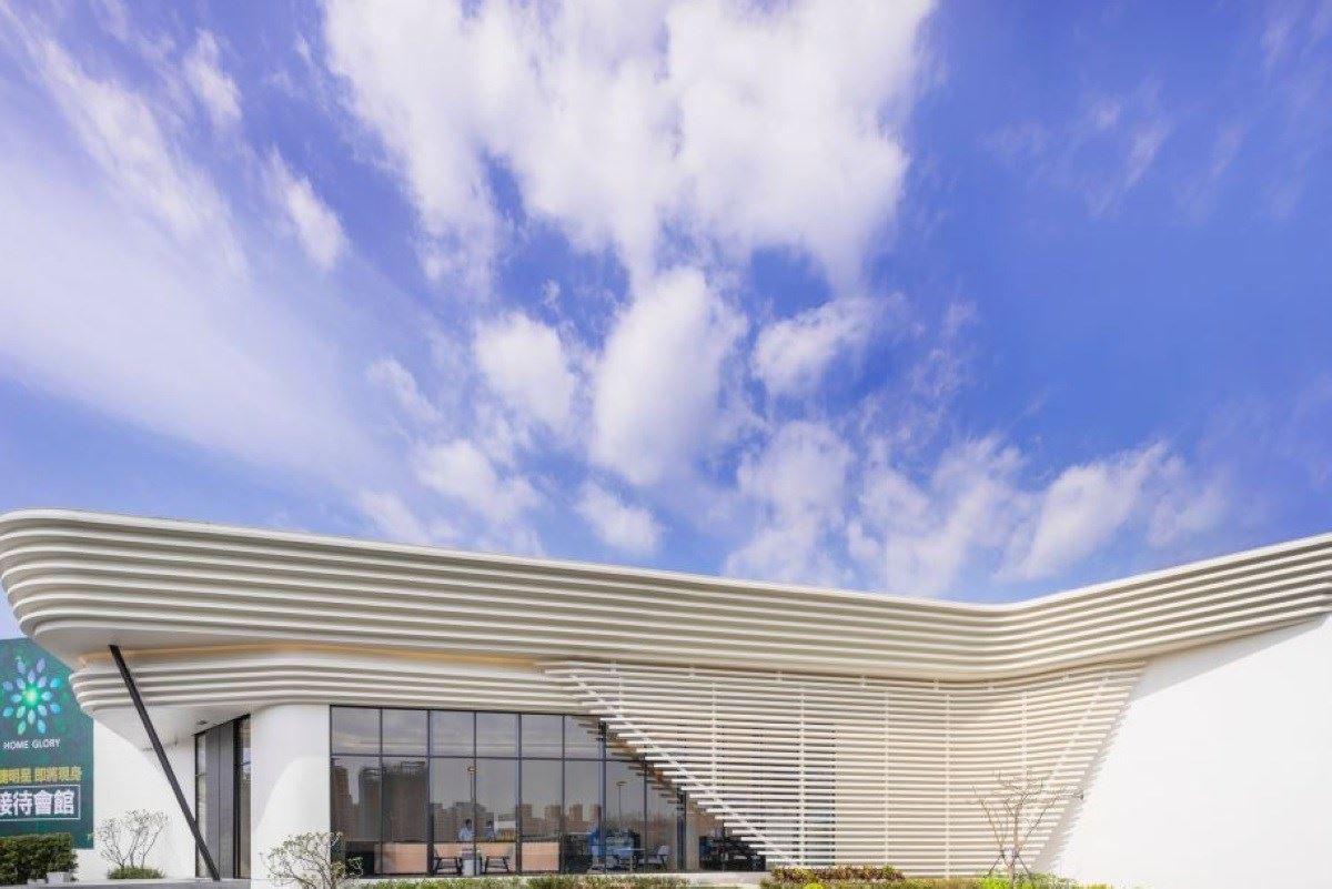 200 坪的現代風接待中心,透過迎賓櫃台前的大面積開窗,反射著藍天白雲的純粹,流...