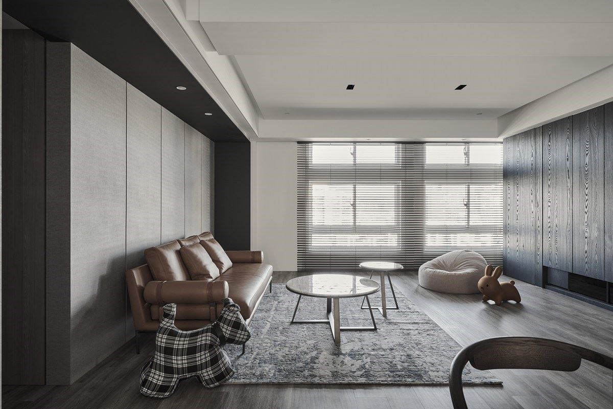 45 坪的毛胚屋,以黑白色系的現代風格,搭配溫暖的超耐磨木地板,營造出簡約舒適的...