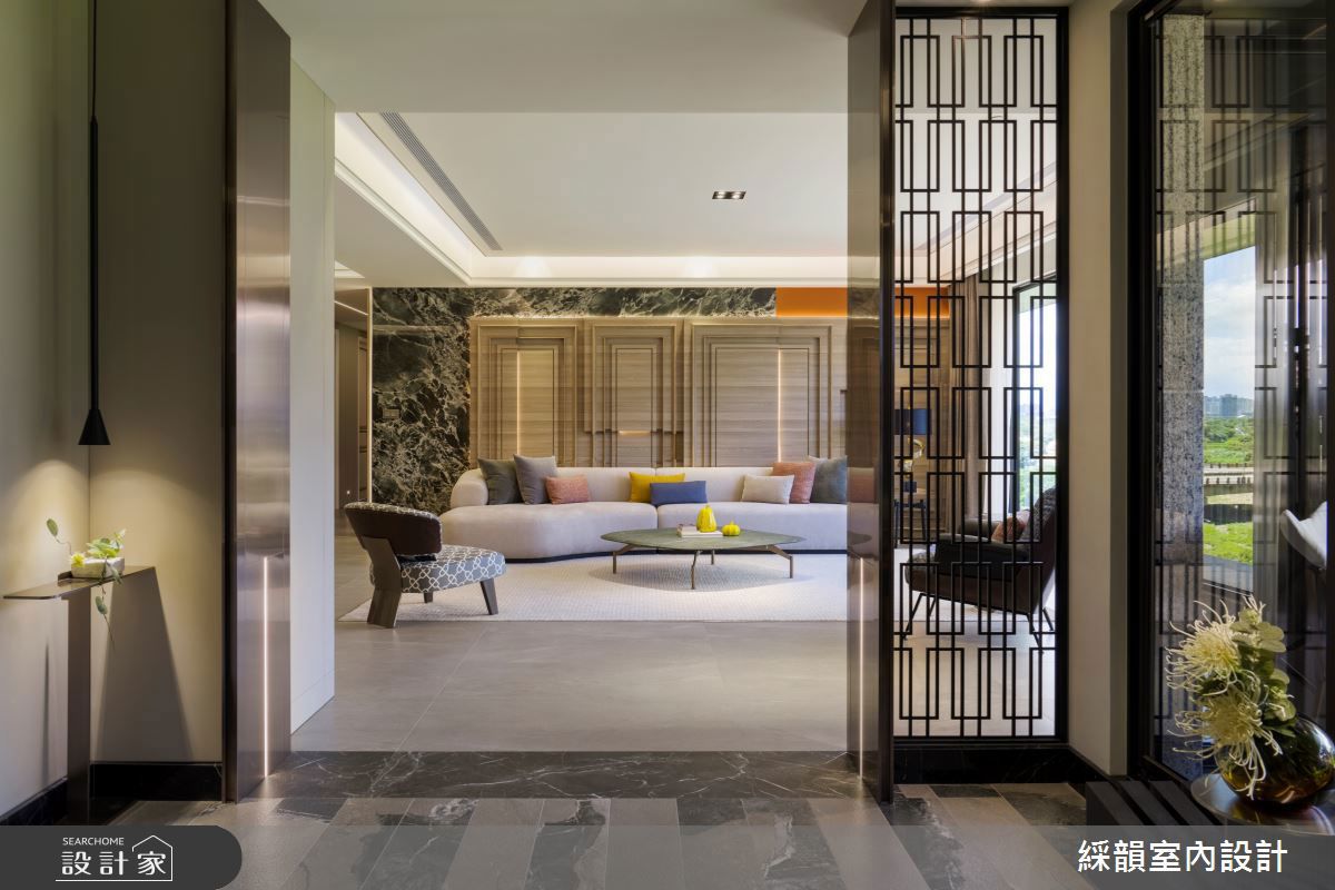 由綵韻室內設計精心規劃的107坪三房住宅空間。因應屋主需求,設計師運用現代殖民風作為主軸,搭配皮革、線板、板岩、大理石、薄板磚、不鏽鋼、鐵件、鍍鈦金屬、仿古鏽鏡,打造全家人的夢想家居。