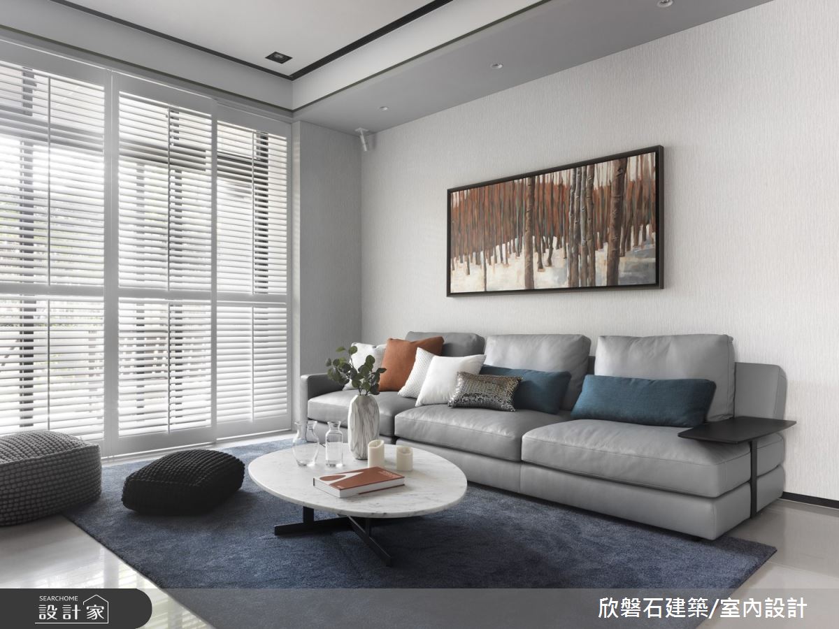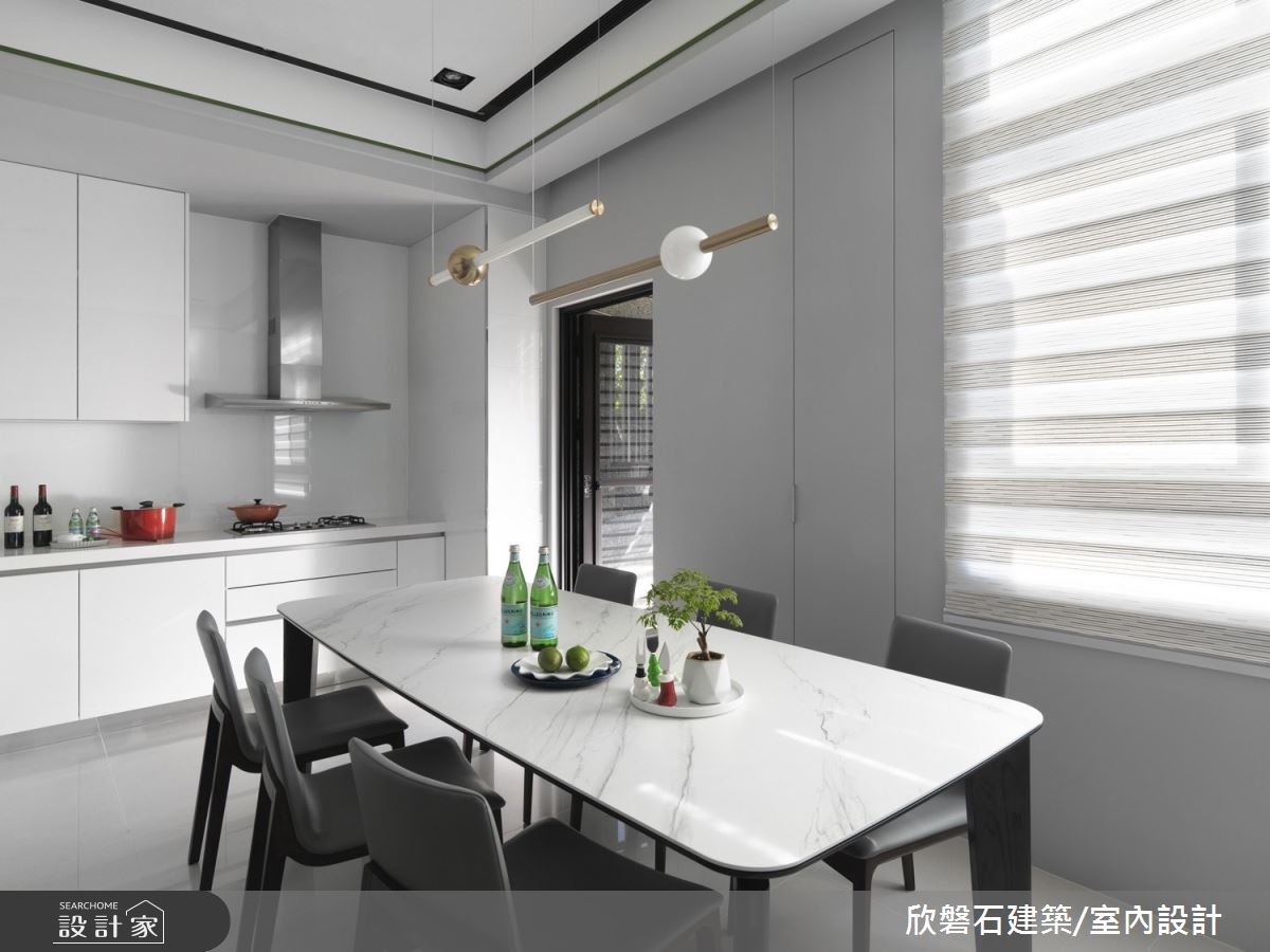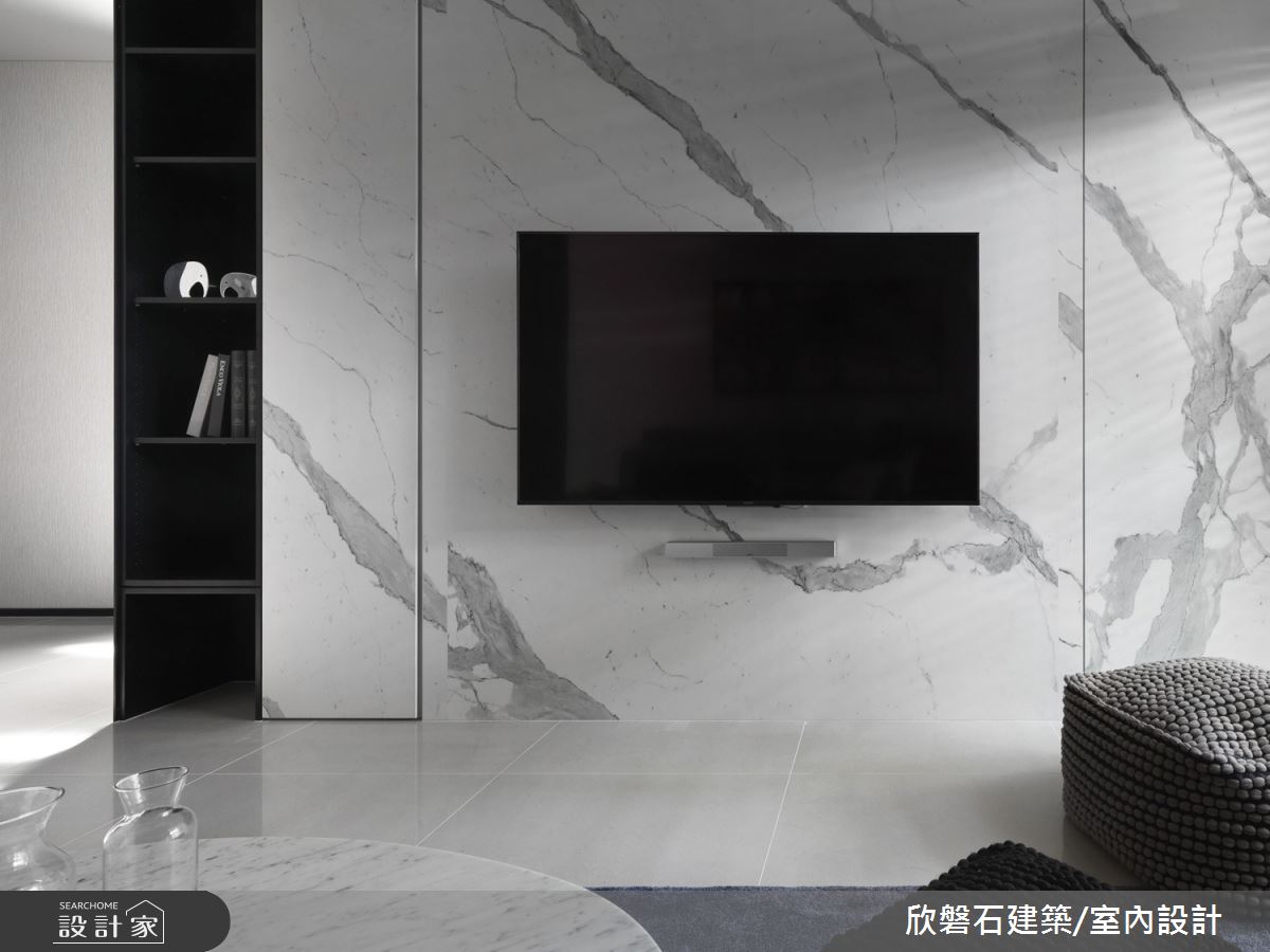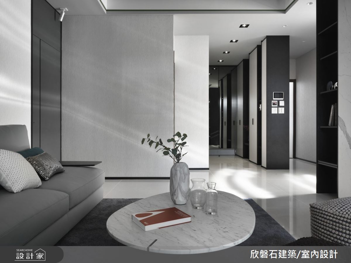 位於一樓坐擁庭院的 67 坪現代風格宅裡,設計師將公領域的收納集中在玄關區域,利用黑白相間的色彩變化降低收納櫃的量體;線性排列的櫃體順帶形塑出通往室內的廊道,灰鏡的嵌入在視覺上延長了玄關走道,長度以採光窗作為頓點,創造沈澱心靈的陽光過場。順著走道進入客廳,電視櫃與玄關收納牆切齊的佈局另空間更為俐落寬敞,電視牆以開放式櫃體結合大理石紋薄石板造型,兼顧主牆收納與美型設計。