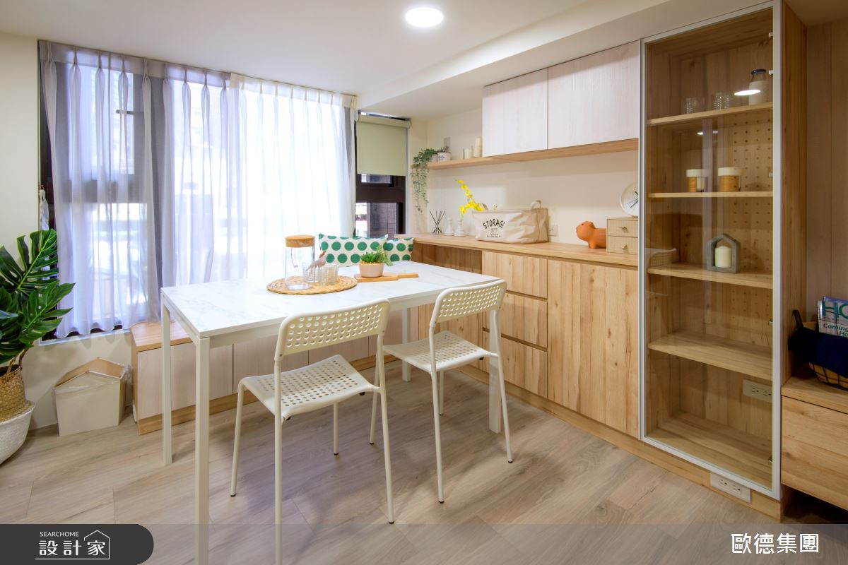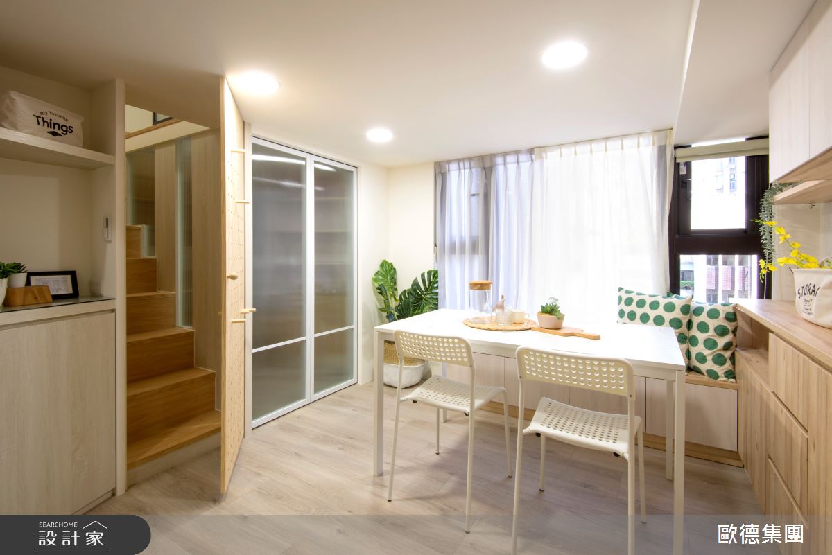 18 坪的休閒風小宅,屬於挑高夾層的特殊格局,因此設計師透過巧妙的雙梯設計,整合縱向、橫向的空間劃分,加上流暢的動線銜接,實現三房兩廳的生活夢想。此外,設計師活用優渥系統櫃、多功能洞洞板,將畸零空間化作居家的機能重點,增添雙倍的收納空間,激發出超乎想像的小宅潛力。