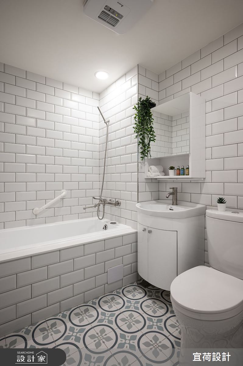 僅有 9 坪的套房空間,透過宜荷設計精準的比例掌握,利用高度爭取收納空間,公共區域更規劃出寬敞的客廳、廚房、臥室、衣物收納區,打造出完整的空間機能,另外也保留原有的溫泉管線,設計師浴室內鋪設純白鐵道磚、花磚,營造優雅又迷人的洗浴時光。