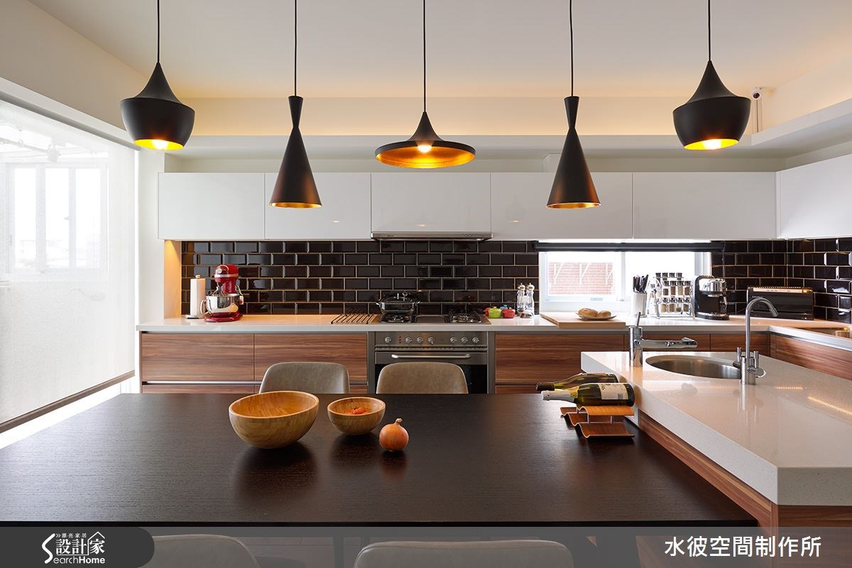 灰色條紋拼貼的牛皮毯與電視牆質材拼貼.餐廳展示櫃質材拼貼語彙統一貫徹。