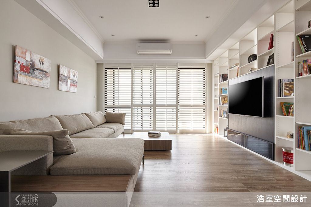 40 坪的新成屋,除了精密實用的空間規劃,以及兒童的安全考量,另外,更引渡陽光進駐,當日光斜射入內,透過木百葉和展示櫃的疏漏間,
