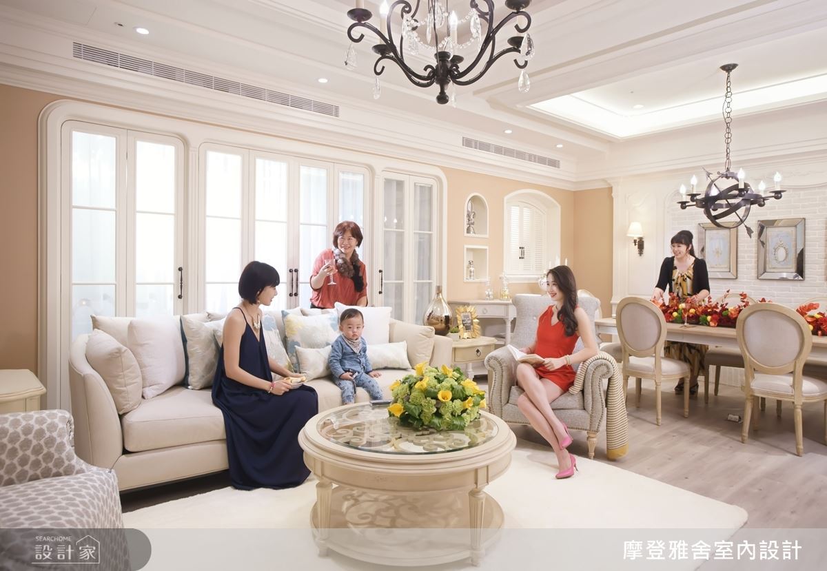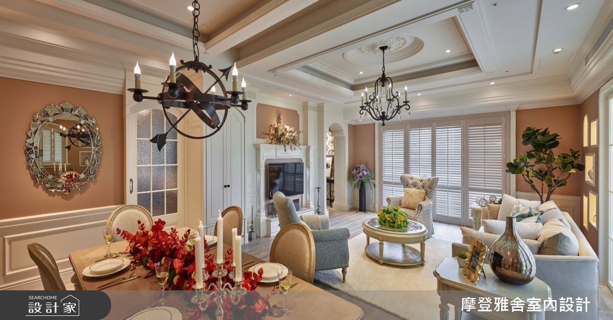 75 坪大宅內,設計師採以新古典風為基底,透過天花造型、線板修飾,以及些許金屬元素等注入小華麗質感,讓住宅兼具浪漫與溫馨感受,打