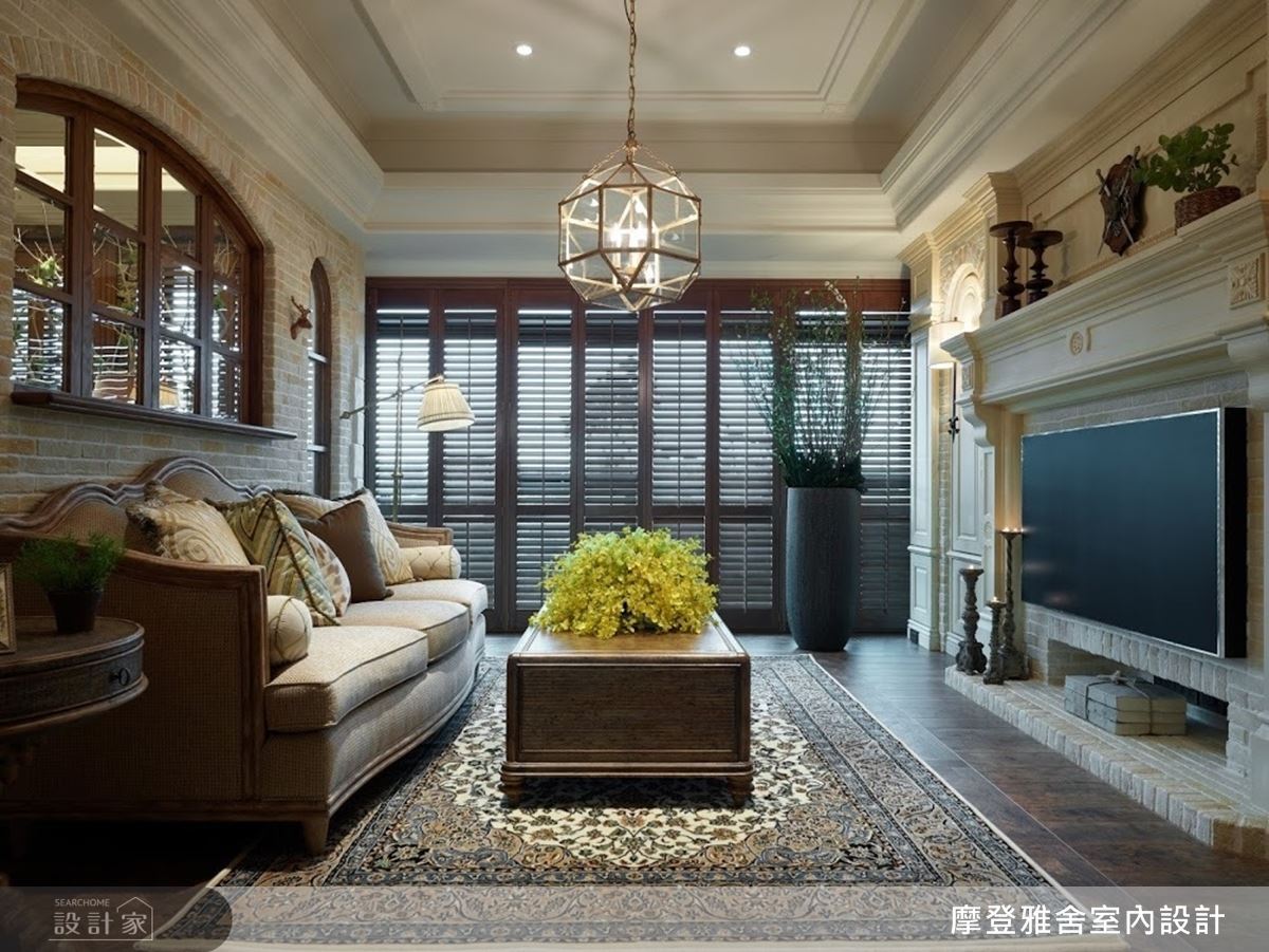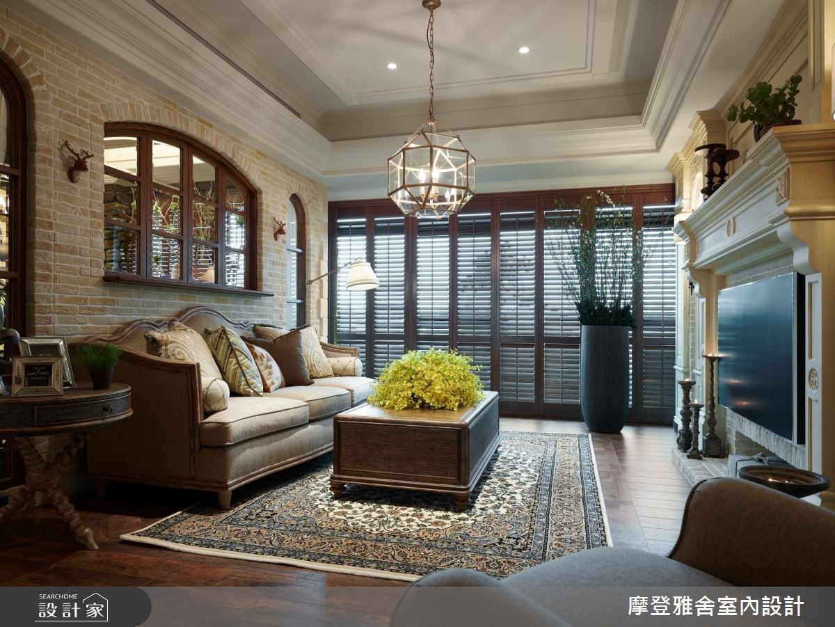 50 坪大宅,設計師採以花磚、壁紙、文化石、仿古燈具等點綴,並給予鄉村風挹注,描繪出歐洲古堡的復古風情,讓屋主可在忙碌生活中、感