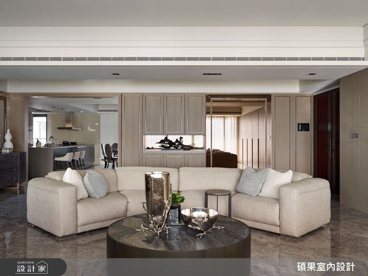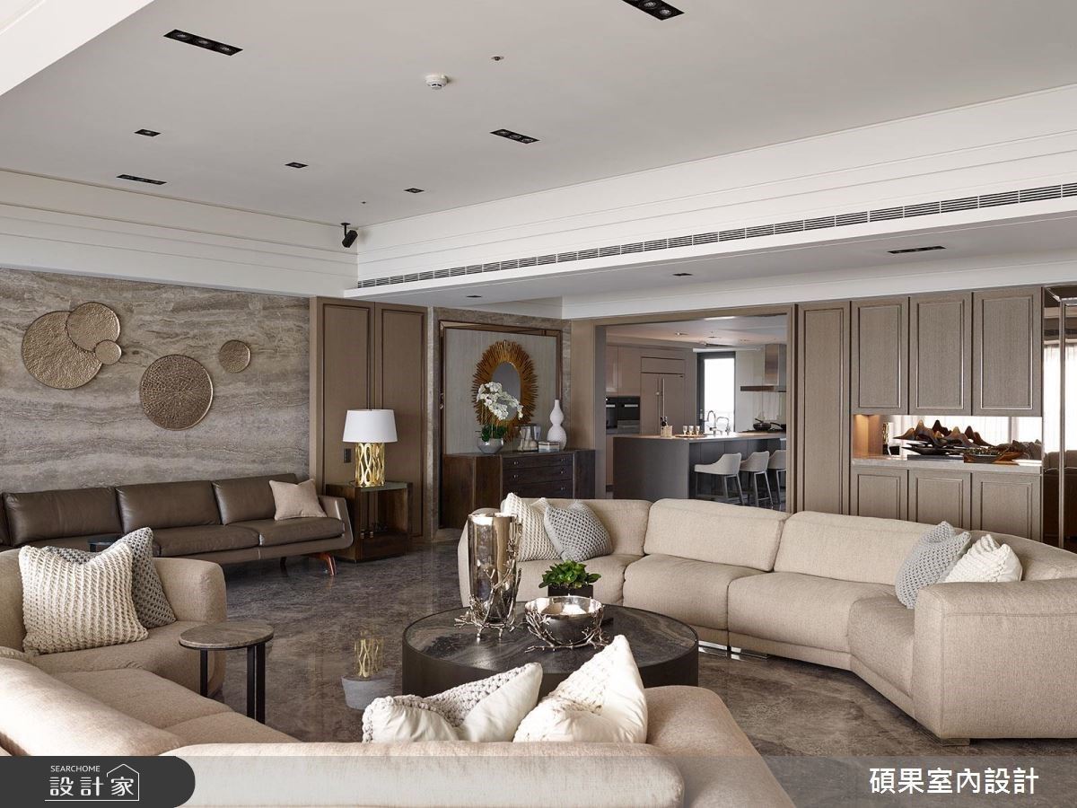72 坪的豪宅,擁有開闊大尺度的空間比例,設計師將空間適度分配後,以優雅的香檳金色搭配沉穩大地色系,再結合大理石與美式線板,巧妙
