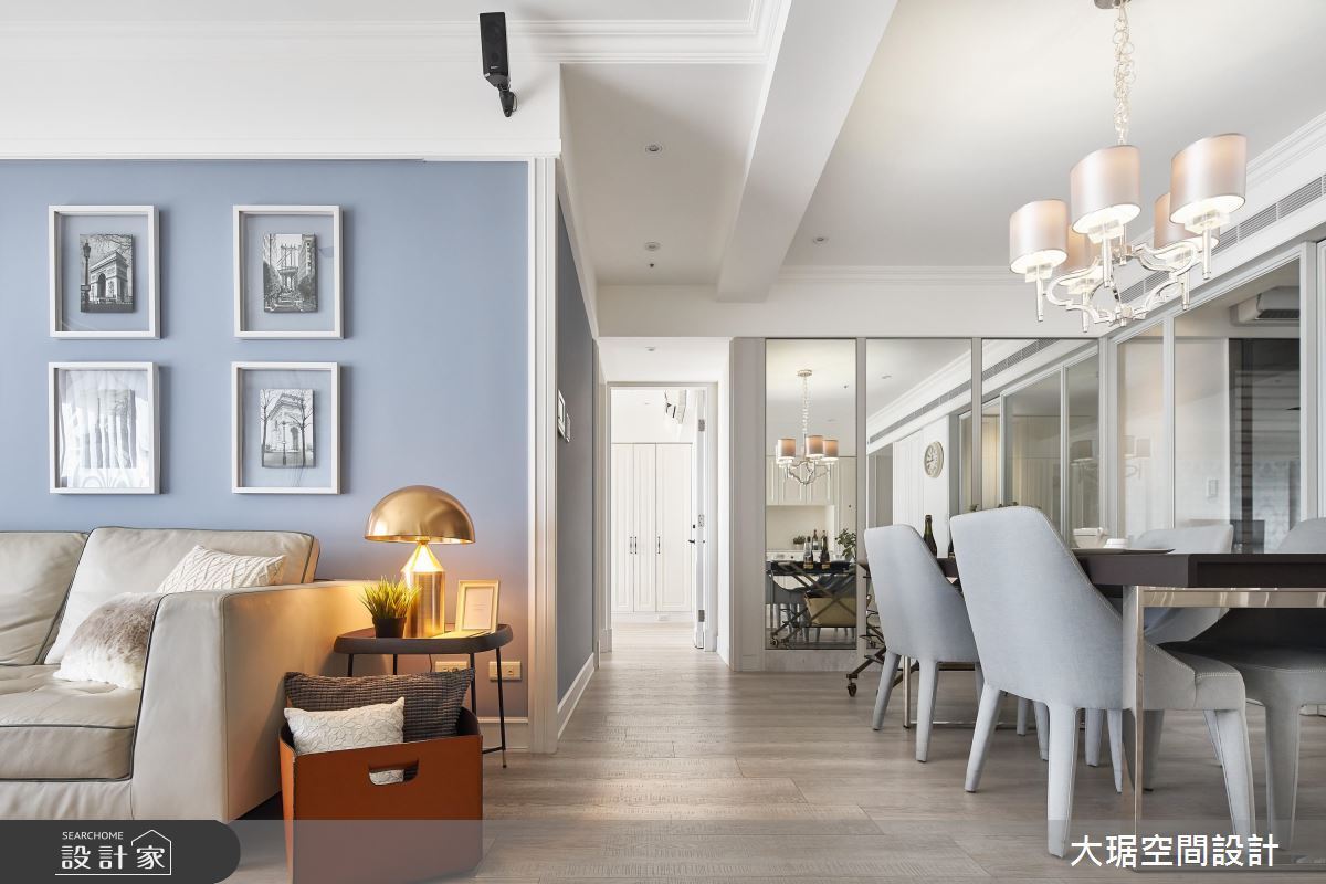 28 坪居家場域,設計師引用美式風替空間定調,於室內揮灑安定的灰藍色,並佐以線板、鏡面調和,成功打造低調奢華的溫馨住所,快跟著小