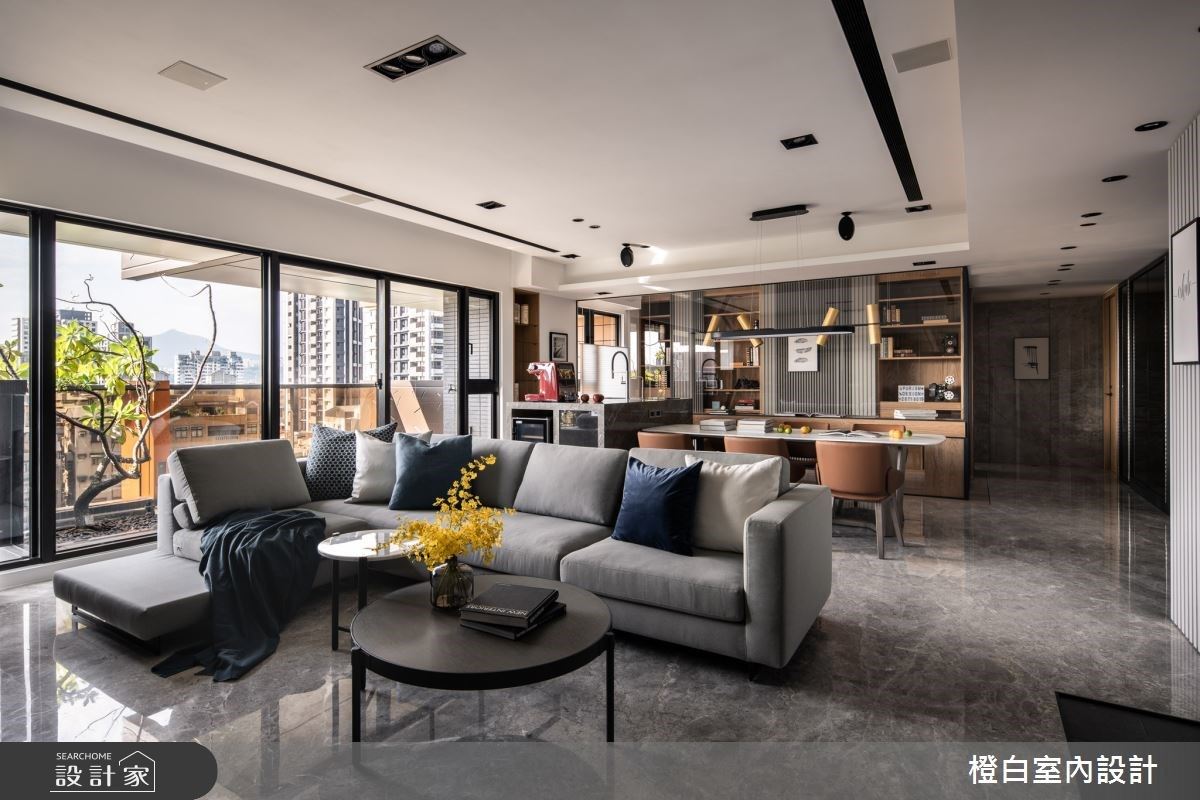 55坪單層住宅,挹注優雅低調的大理石材,從地坪、電視主牆一路延伸至中島櫃體,混搭玻璃、鐵件與木質等不同元素,為室內注入一絲奢華