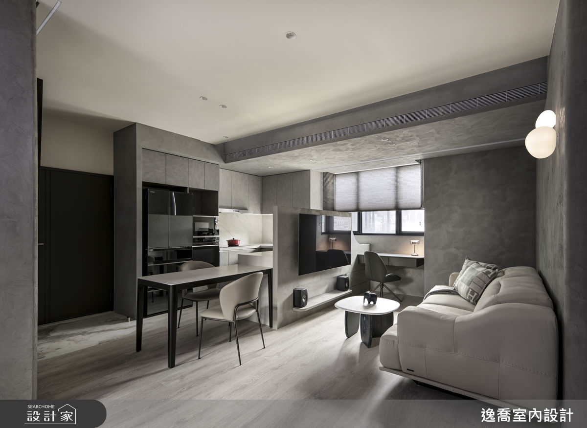走入35坪的現代風居宅,空間色彩以黑灰色為主調,搭佐淺色木質保留場域溫度,逸喬室內設計的蔣孝琪、陳芸霠設計師,縝密規劃屋主現階