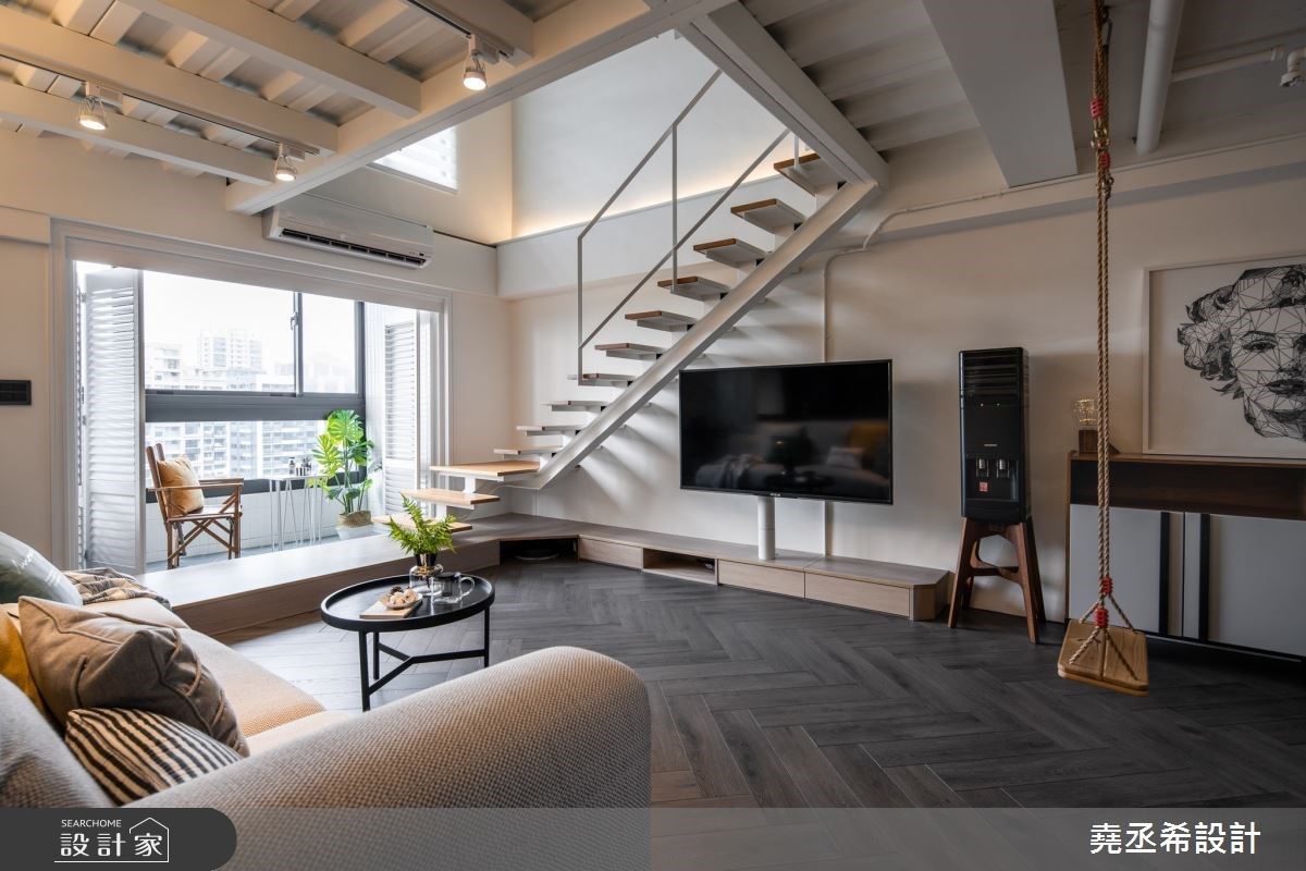 走入50坪混搭風樓中樓,設計師為了打造一家人的夢想家居,在客廳空間加入的鞦韆元素,隨之成為空間的視覺亮點,讓公共領域添加一絲童