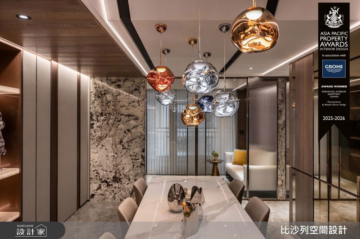 93 坪的四層樓透天別墅,在每一層掌握不同的色彩與材質比例,透過石材、鍍鈦金屬、木皮、鋼琴烤漆、繃布等異材質混搭,表現公私領域的