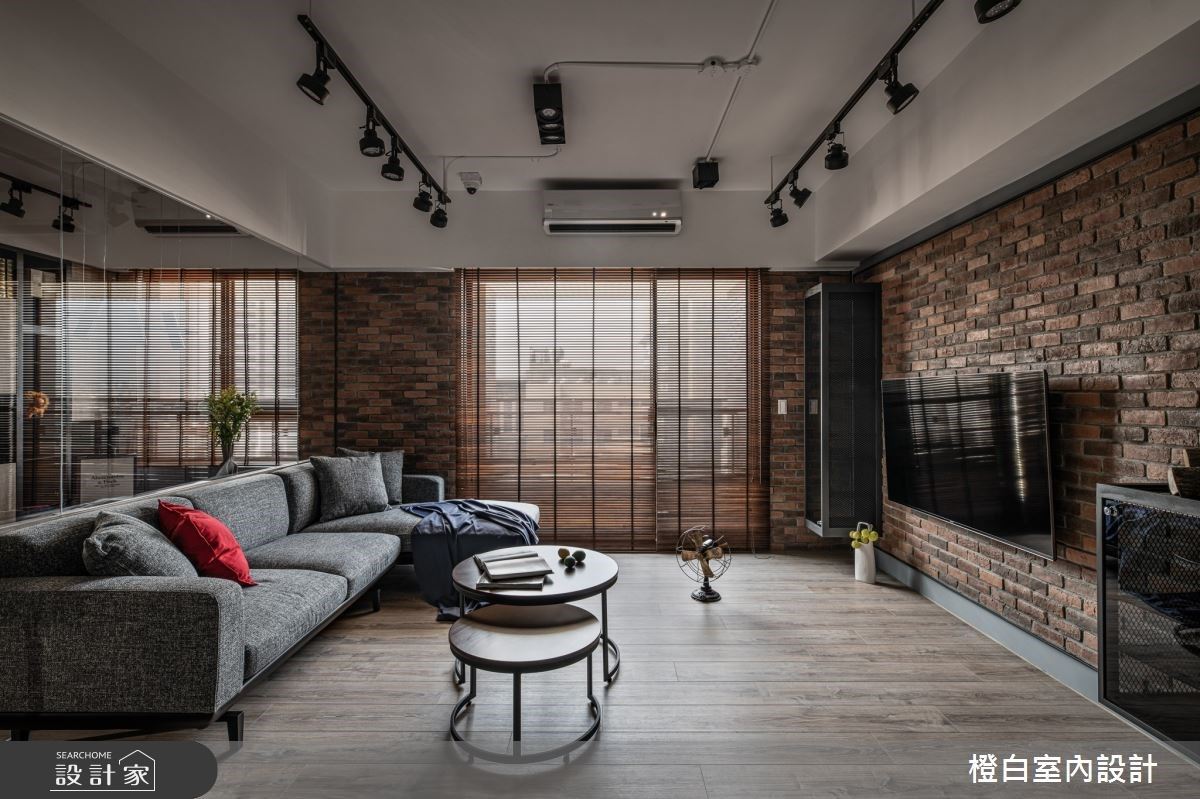 32 坪混搭風單身宅結合文化石、鐵件烤漆、跳色漆、穀倉門、軌道燈、灰玻和灰鏡等多元建材,同時運用貨櫃造型的儲藏空間、篝火裝飾與國